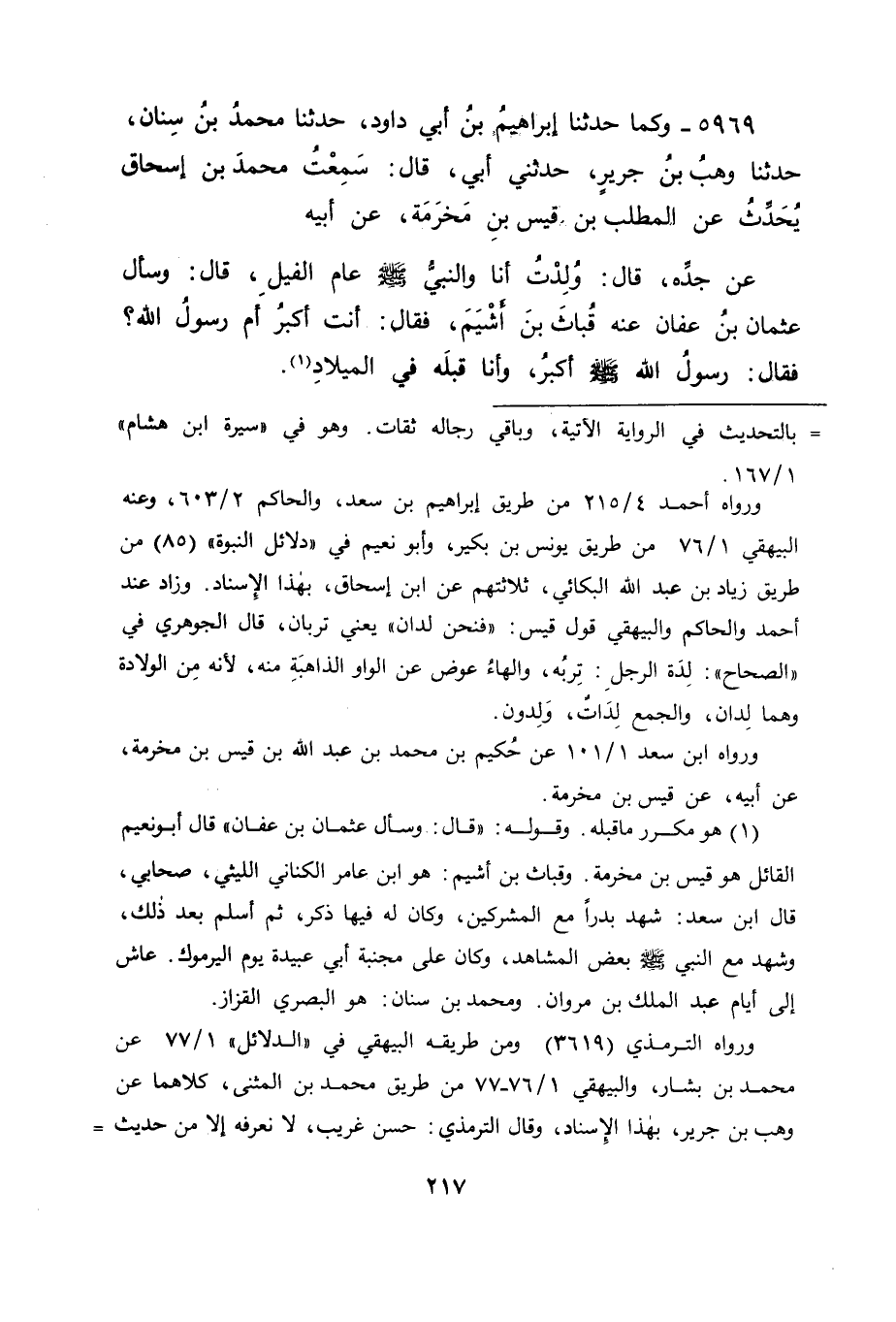 5969 - وَكَمَا حَدَّثَنَا إِبْرَاهِيمُ بْنُ أَبِي دَاوُدَ، حَدَّثَنَا مُحَمَّدُ بْنُ سِنَانٍ، حَدَّثَنَا وَهْبُ بْنُ جَرِيرٍ، حَدَّثَنِي أَبِي قَالَ: سَمِعْتُ مُحَمَّدَ بْنَ إِسْحَاقَ، يُحَدِّثُ، عَنِ الْمُطَّلِبِ بْنِ قَيْسِ بْنِ مَخْرَمَةَ، عَنْ أَبِيهِ، عَنْ جَدِّهِ، قَالَ: " وُلِدْتُ أَنَا والنَّبِيُّ صَلَّى اللَّهُ عَلَيْهِ وَسَلَّمَ عَامَ الْفِيلِ، قَالَ: وَسَأَلَ عُثْمَانُ بْنُ عَفَّانَ عَنْهُ قُبَاثَ بْنَ أَشْيَمَ، فَقَالَ: أَنْتَ أَكْبَرُ أَمْ رَسُولُ اللهِ؟ فَقَالَ: رَسُولُ اللهِ صَلَّى اللَّهُ عَلَيْهِ وَسَلَّمَ أَكْبَرُ، وَأَنَا قَبْلَهُ فِي الْمِيلَادِ "