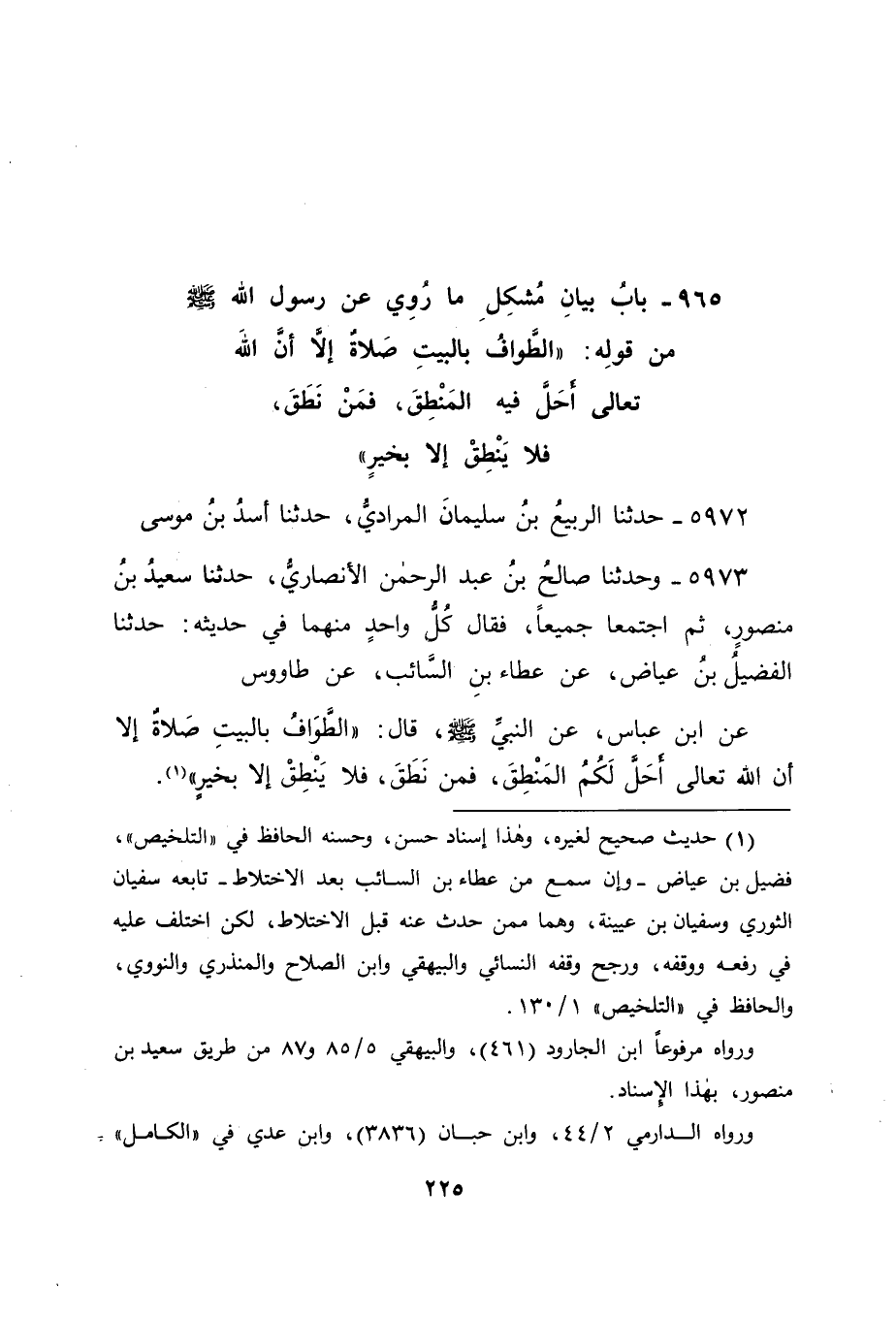 5973 - وَحَدَّثَنَا صَالِحُ بْنُ عَبْدِ الرَّحْمَنِ الْأَنْصَارِيُّ، حَدَّثَنَا سَعِيدُ بْنُ مَنْصُورٍ، ثُمَّ اجْتَمَعَا جَمِيعًا، فَقَالَ كُلُّ وَاحِدٍ مِنْهُمَا فِي حَدِيثِهِ: حَدَّثَنَا الْفُضَيْلُ بْنُ عِيَاضٍ، عَنْ عَطَاءِ بْنِ السَّائِبِ، عَنْ طَاوُسٍ، عَنِ ابْنِ عَبَّاسٍ عَنِ النَّبِيِّ صَلَّى اللَّهُ عَلَيْهِ وَسَلَّمَ قَالَ: " الطَّوَافُ بِالْبَيْتِ صَلَاةٌ، إِلَّا أَنَّ اللهَ تَعَالَى أَحَلَّ لَكُمُ الْمَنْطِقَ، فَمَنْ نَطَقَ، فَلَا يَنْطِقْ إِلَّا -[227]- بِخَيْرٍ " -[228]- قَالَ أَبُو جَعْفَرٍ: فَتَأَمَّلْنَا هَذَا الْحَدِيثَ إِذْ كُنَّا لَمْ نَجِدْهُ بِهَذَا الْإِسْنَادِ، إِلَّا مِنْ هَذِهِ الْجِهَةِ الَّتِي ذَكَرْنَا. فَوَجَدْنَا رِوَايَةَ الْفُضَيْلِ بْنِ عِيَاضٍ وَمَنْ سِوَاهُ مِنَ الرُّوَاةِ عَنْ عَطَاءِ بْنِ السَّائِبِ غَيْرَ الثَّوْرِيِّ، وَالْحَمَّادَيْنِ: حَمَّادِ بْنِ سَلَمَةَ، وَحَمَّادِ بْنِ زَيْدٍ، وَيَزِيدَ بْنِ زُرَيْعٍ، مِمَّا يُضَعِّفُهُ أَهْلُ الْإِسْنَادِ، لِأَنَّ سَمَاعَهُمْ مِنْهُ كَانَ بَعْدَ الِاخْتِلَاطِ، وَكَانَ سَمَاعُ الْأَرْبَعَةِ الَّذِينَ ذَكَرْنَا فِيهِ قَبْلَ ذَلِكَ