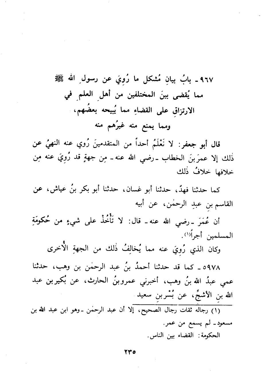 بَابُ بَيَانِ مُشْكِلِ مَا رُوِيَ عَنْ رَسُولِ اللهِ صَلَّى اللَّهُ عَلَيْهِ وَسَلَّمَ مِمَّا يَقْضِي بَيْنَ الْمُخْتَلِفِينَ مِنْ أَهْلِ الْعِلْمِ فِي الِارْتِزَاقِ عَلَى الْقَضَاءِ مِمَّا يُبِيحُهُ بَعْضُهُمْ، وَمِمَّا يَمْنَعُ مِنْهُ غَيْرُهُمْ مِنْهُ قَالَ أَبُو جَعْفَرٍ: لَا نَعْلَمُ أَحَدًا مِنَ الْمُتَقَدِّمِينَ رُوِيَ عَنْهُ النَّهْي عَنْ ذَلِكَ إِلَّا عُمَرَ بْنَ الْخَطَّابِ رَضِيَ اللهُ عَنْهُ، مِنْ جِهَةٍ قَدْ رُوِيَ عَنْهُ مِنْ خِلَافِهَا خِلَافُ ذَلِكَ