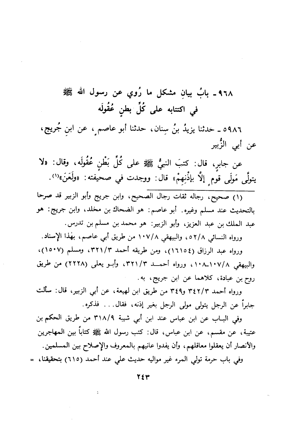 5986 - حَدَّثَنَا يَزِيدُ بْنُ سِنَانٍ، حَدَّثَنَا أَبُو عَاصِمٍ، عَنِ ابْنِ جُرَيْجٍ، عَنْ أَبِي الزُّبَيْرِ، عَنْ جَابِرٍ قَالَ: كَتَبَ النَّبِيُّ صَلَّى اللَّهُ عَلَيْهِ وَسَلَّمَ عَلَى كُلِّ بَطْنٍ عُقُولَهُ، وَقَالَ: " لَا يَتَوَلَّى مَوْلَى قَوْمٍ إِلَّا بِإِذْنِهِمْ "، قَالَ: وَوَجَدْتُ فِي صَحِيفَتِهِ: " وَلَعَنَ " -[244]- قَالَ أَبُو جَعْفَرٍ: فَتَأَمَّلْنَا هَذَا الْحَدِيثَ فَوَجَدْنَا فِيهِ كِتَابُ النَّبِيِّ عَلَيْهِ السَّلَامُ عُقُولَ جِنَايَاتِ كُلِّ بَطْنٍ عَلَى ذَلِكَ الْبَطْنِ، فَمَعْقُولٌ أَنَّ فِيهِ مِنْ قَرَابَتِهِ مِنَ الْجَانِي خِلَافَ قَرَابَةِ غَيْرِهِ مِنْ أَهْلِ ذَلِكَ الْبَطْنِ مِنَ الْبُعْدِ مِنْهُ، وَمِنَ الْقُرْبِ، فَكَتَبَهَا رَسُولُ اللهِ صَلَّى اللَّهُ عَلَيْهِ وَسَلَّمَ عَلَى جَمِيعِ بَطْنِهِ الَّذِينَ هَذِهِ صِفَتُهُمْ، وَلَمْ يَقْصِدْ فِي ذَلِكَ إِلَى أَقْرَبِهِمْ مِنْهُ دُونَ أَبْعَدِهِمْ مِنْهُ، بَلْ قَصَدَ بِذَلِكَ إِلَى الْبَطْنِ الَّذِي هُوَ مِنْهُ، فَجَعَلَ عُقُولَ جِنَايَاتِ أَهْلِهِ عَلَى ذَلِكَ الْبَطْنِ وَفِيمَا ذَكَرْنَا مِنْ ذَلِكَ مَا قَدْ دَلَّ عَلَى أَنَّهُ لَا يَجِبُ أَنْ يَقْصِدَ فِي ذَلِكَ بِالْعَقْلِ لِلْجِنَايَةِ مِنَ الْجَانِي إِلَى أَحَدٍ مِنَ الْبَطْنِ الَّذِي هُوَ مِنْهُ دُونَ أَحَدٍ مِنْ بَطْنِهِ ذَلِكَ، وَهَذَا يَدُلُّ عَلَى مَا كَانَ فُقَهَاءُ الْأَمْصَارِ أَهْلُ الْكُوفَةِ وَأَهْلُ الْمَدِينَةِ يَذْهَبُونَ إِلَيْهِ فِي تَحْمِيلِهِمْ أُرُوَشَ عَوَاقِلِ الْجُنَاةِ الَّذِينَ تَجْمَعُهُمْ وَإِيَّاهُمُ الْبَطْنُ الَّذِي هُمْ مِنْهُ، إِلَّا أَنْ يَعْجِزُوا عَنْ ذَلِكَ، فَيَضُمُّ إِلَيْهِمْ أَقْرَبَ الْبُطُونِ إِلَيْهِمْ فِيهِ، حَتَّى يَعْقِلُوا الْوَاجِبَ فِي تِلْكَ الْجِنَايَةِ. وَعَلَى خِلَافِ مَا قَالَهُ غَيْرُهُمْ، مِنْهُمُ الشَّافِعِيُّ: أَنَّ مَعْرِفَةَ الْعَاقِلَةَ أَنْ يُنْظَرَ إِلَى إِخْوَةِ الْجَانِي لِأَبِيهِ، فَيَحْمِلُونَ أَرْشَ جِنَايَتِهِ، فَإِنْ لَمْ يَحْمِلُوهَا -[245]- رُفِعَتْ إِلَى بَنِي جَدِّهِ، فَإِنْ لَمْ يَحْتَمِلُوهَا، رُفِعَتْ إِلَى بَنِي جَدِّ أَبِيهِ، ثُمَّ هَكَذَا يَرْتَفِعُ إِلَى ابْنِ أَبٍ، حِينَ يَعْجِزُ مَنْ هُوَ أَقْرَبُ مِنْهُ عَمَّا تَحَمَّلَ عَنِ الْجَانِي مِنْ ذَلِكَ، لِأَنَّ هَؤُلَاءِ جَمِيعًا، وَإِنْ تَبَايَنُوا فِي الْقَرَابَةِ مِنَ الْجَانِي بِالْقُرْبِ وَالْبُعْدِ، فَهُمْ مِنْ أَهْلِ الْبَطْنِ الَّذِي هُوَ مِنْهُ، وَإِنَّمَا كَتَبَ النَّبِيُّ صَلَّى اللَّهُ عَلَيْهِ وَسَلَّمَ عَقْلَ كُلِّ بَطْنٍ عَلَى ذَلِكَ الْبَطْنِ، وَلَمْ يَكْتُبْهُ عَلَى أَقْرَبِ ذَلِكَ الْبَطْنِ إِلَى الْجَانِي دُونَ مَنْ سِوَاهُمْ مِنْ أَهْلِ ذَلِكَ الْبَطْنِ، مِمَّنْ هُوَ أَبْعَدُ مِنْهُمْ. وَقَدْ رُوِيَ عَنْ عُمَرَ بْنِ الْخَطَّابِ رَضِيَ اللهُ عَنْهُ، مَا يَدُلُّ عَلَى هَذَا الْمَعْنَى أَيْضًا