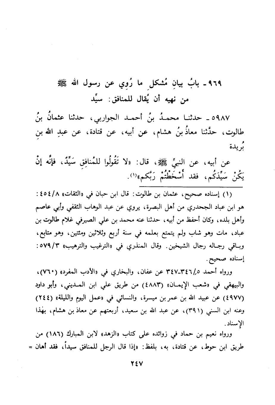 5987 - حَدَّثَنَا مُحَمَّدُ بْنُ أَحْمَدَ الْجَوَارِبِيُّ، حَدَّثَنَا عُثْمَانُ بْنُ طَالُوتَ، حَدَّثَنَا مُعَاذُ بْنُ هِشَامٍ، عَنْ أَبِيهِ، عَنْ قَتَادَةَ، عَنْ عَبْدِ اللهِ بْنِ بُرَيْدَةَ، عَنْ أَبِيهِ، عَنِ النَّبِيِّ صَلَّى اللَّهُ عَلَيْهِ وَسَلَّمَ، قَالَ: " لَا تَقُولُوا لِلْمُنَافِقِ سَيِّدٌ، فَإِنَّهُ إِنْ يَكُنْ سَيِّدَكُمْ، فَقَدْ أَسْخَطْتُمْ رَبَّكُمْ " -[248]- قَالَ أَبُو جَعْفَرٍ: فَتَأَمَّلْنَا مَا فِي هَذَا الْحَدِيثِ، فَوَجَدْنَا السَّيِّدَ الْمُسْتَحِقَّ لِلسَّؤْدَدِ هُوَ الَّذِي مَعَهُ الْأَسْبَابُ الْعَالِيَةُ الَّتِي يَسْتَحِقُّ بِهَا ذَلِكَ، وَيَبِينُ بِهَا عَمَّنْ سِوَاهُ مِمَّنْ سَادَهُ، كَمَا قَالَ رَسُولُ اللهِ صَلَّى اللَّهُ عَلَيْهِ وَسَلَّمَ لِلْأَنْصَارِ لَمَّا أَقْبَلَ إِلَيْهِ سَعْدُ بْنُ مُعَاذٍ بَعْدَ أَنْ حَكَمَ فِي بَنِي قُرَيْظَةَ، بِمَا كَانَ حَكَمَ بِهِ فِيهِمْ، وَبَعْدَ أَنْ قَالَ لَهُ رَسُولُ اللهِ صَلَّى اللَّهُ عَلَيْهِ وَسَلَّمَ فِي حُكْمِهِ ذَلِكَ: " لَقَدْ حَكَمْتَ فِيهِمْ بِحُكْمِ اللهِ مِنْ فَوْقِ سَبْعِ سَمَاوَاتٍ، قُومُوا إِلَى سَيِّدِكُمْ " , وَقَدْ ذَكَرْنَا ذَلِكَ بِإِسْنَادِهِ فِيمَا تَقَدَّمَ مِنَّا فِي كِتَابِنَا هَذَا. وَمِنْ ذَلِكَ قَوْلُهُ صَلَّى اللَّهُ عَلَيْهِ وَسَلَّمَ لِبَنِي سَلَمَةَ: " مَنْ سَيِّدُكُمْ يَا بَنِي سَلَمَةَ "؟ قَالُوا: الْجَدُّ بْنُ قَيْسٍ ثُمَّ ذُكِرَ بِالْبُخْلِ فَقَالَ: " لَيْسَ ذَلِكَ سَيِّدُكُمْ وَلَكِنَّ سَيِّدَكُمْ بِشْرُ بْنُ الْبَرَاءِ بْنِ مَعْرُورٍ. وَقَدْ ذَكَرْنَا ذَلِكَ أَيْضًا بِإِسْنَادِهِ فِيمَا تَقَدَّمَ مِنَّا فِي كِتَابِنَا هَذَا، وَكَمَا قَالَ جَابِرُ بْنُ عَبْدِ اللهِ: " أَبُو بَكْرٍ رَضِيَ اللهُ عَنْهُ سَيِّدُنَا، وَأَعْتَقَ -[249]- سَيِّدَنَا " يَعْنِي بِلَالًا. كَمَا حَدَّثَنَا عَلِيُّ بْنُ شَيْبَةَ، حَدَّثَنَا يَزِيدُ بْنُ هَارُونَ، أَخْبَرَنَا عَبْدُ الْعَزِيزِ بْنُ عَبْدِ اللهِ بْنِ أَبِي سَلَمَةَ، عَنْ مُحَمَّدِ بْنِ الْمُنْكَدِرِ، عَنْ جَابِرٍ، ثُمَّ ذَكَرَهُ. فَكَانَ مَنْ يَسْتَحِقُّ هَذَا الِاسْمَ وَالْكَوْنَ بِهَذَا الْمَكَانِ مَنْ هَذِهِ صِفَتُهُ، وَكَانَ الْمُنَافِقُ بِضِدِّ ذَلِكَ، وَلَمَّا كَانَ كَذَلِكَ لَمْ يَسْتَحِقَّ بِهِ أَنْ يَكُونَ سَيِّدًا، وَكَانَ مَنْ سَمَّاهُ بِذَلِكَ وَاضِعًا لَهُ بِخِلَافِ الْمَكَانِ الَّذِي وَضَعَهُ اللهُ بِذَلِكَ، وَكَانَ بِذَلِكَ مُسْخِطًا لِرَبِّهِ.