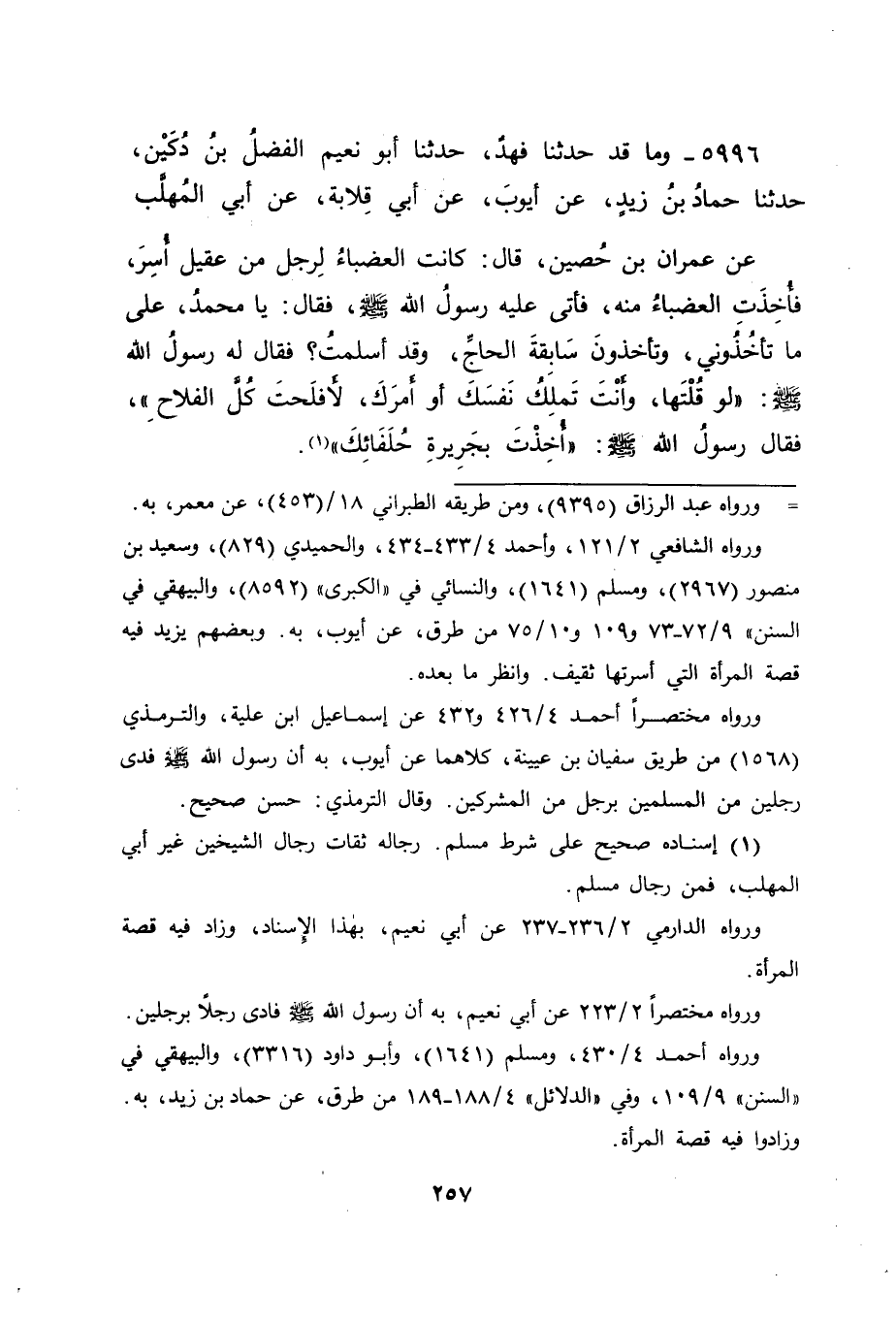 5996 - وَمَا قَدْ حَدَّثَنَا فَهْدٌ، حَدَّثَنَا أَبُو نُعَيْمٍ الْفَضْلُ بْنُ دُكَيْنٍ، حَدَّثَنَا حَمَّادُ بْنُ زَيْدٍ، عَنْ أَيُّوبَ، عَنْ أَبِي قِلَابَةَ، عَنْ أَبِي الْمُهَلَّبِ، عَنْ عِمْرَانَ بْنِ حُصَيْنٍ قَالَ: كَانَتِ الْعَضْبَاءُ لِرَجُلٍ مِنْ عَقِيلٍ أُسِرَ، فَأُخِذَتِ الْعَضْبَاءُ مِنْهُ، فَأَتَى عَلَيْهِ رَسُولُ اللهِ صَلَّى اللَّهُ عَلَيْهِ وَسَلَّمَ فَقَالَ: يَا مُحَمَّدُ، عَلَى مَا تَأْخُذُونِي، وَتَأْخُذُونَ سَابِقَةَ الْحَاجِّ، وَقَدْ أَسْلَمْتُ؟ فَقَالَ لَهُ رَسُولُ اللهِ صَلَّى اللَّهُ عَلَيْهِ وَسَلَّمَ: " لَوْ قُلْتَهَا، وَأَنْتَ تَمْلِكُ نَفْسَكَ، أَوْ أَمْرَكَ , لَأَفْلَحْتَ كُلَّ الْفَلَاحِ "، فَقَالَ رَسُولُ اللهِ صَلَّى اللَّهُ عَلَيْهِ وَسَلَّمَ: " أُخِذْتَ بِجَرِيرَةِ حُلَفَائِكَ " -[258]- وَكَانَتْ ثَقِيفُ قَدْ أَسَرَتْ رَجُلَيْنِ مِنْ أَصْحَابِ النَّبِيِّ صَلَّى اللَّهُ عَلَيْهِ وَسَلَّمَ، وَإِذَا كَانَ الْمُحَالِفُونَ يُؤَاخَذُونَ بِجَرَائِرِ حُلَفَائِهِمْ، كَمَا يُؤْخَذُونَ بِجَرَائِرِ بَنِي عُمُومَتِهِمْ كَمَا ذَكَرْنَا، كَانُوا بِالْأَخْذِ بِعُقُولِ جِنَايَاتِهِمْ، وَكَانَ الْمُحَالِفُونَ بِأَخْذِهَا عَنْهُمْ أَوْلَى، وَفِيمَا ذَكَرْنَا مَا قَدْ دَلَّ عَلَى أَنَّ الْحُلَفَاءَ يَعْقِلُونَ عَمَّنْ حَالَفُوهُمْ عَنْهُمْ، كَمَا يَعْقِلُ أَهْلُ الْفَخِذِ بَعْضُهُمْ عَنْ بَعْضٍ