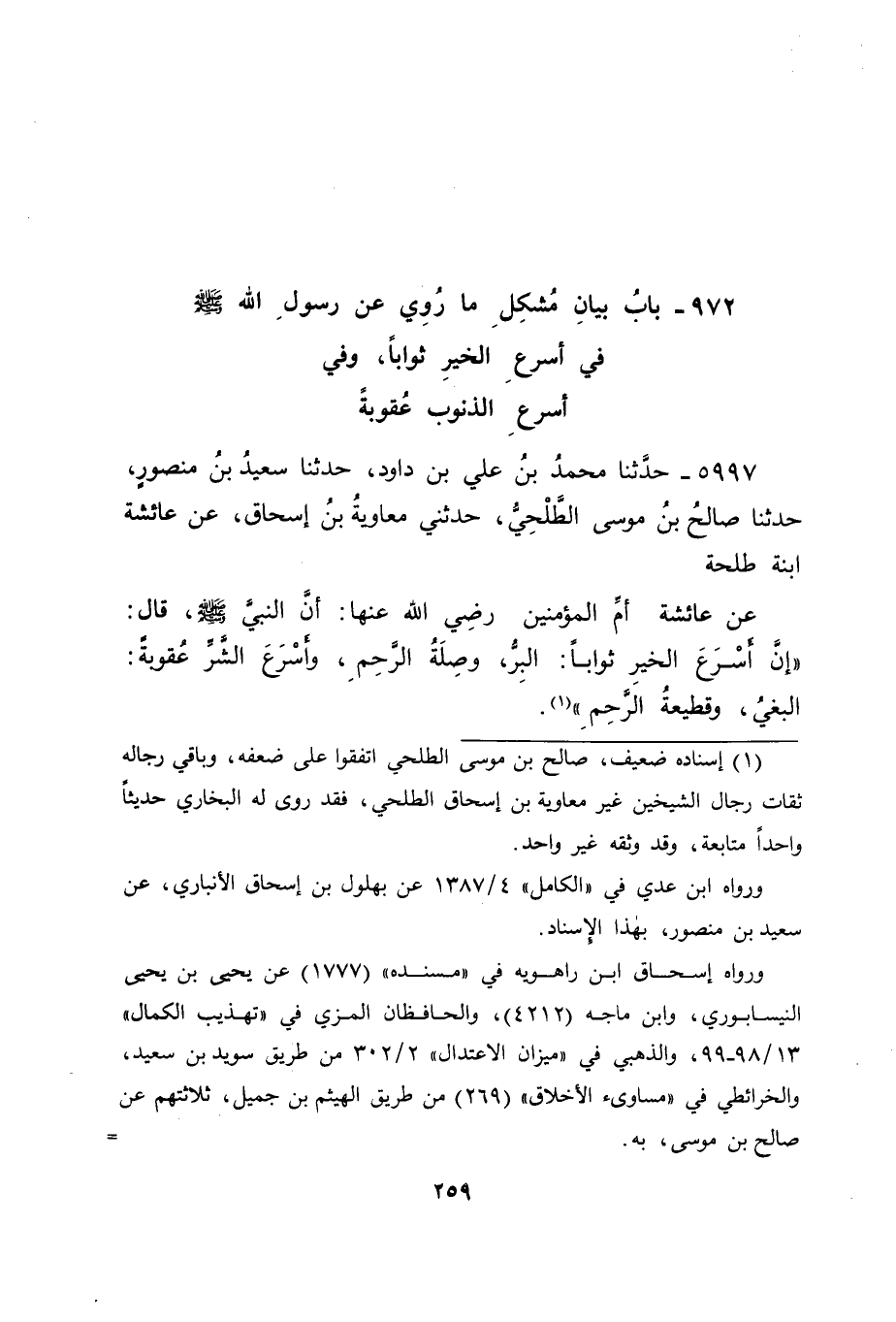 5997 - حَدَّثَنَا مُحَمَّدُ بْنُ عَلِيِّ بْنِ دَاوُدَ، حَدَّثَنَا سَعِيدُ بْنُ مَنْصُورٍ، حَدَّثَنَا صَالِحُ بْنُ مُوسَى الطَّلْحِيُّ، حَدَّثَنِي مُعَاوِيَةُ بْنُ إِسْحَاقَ، عَنْ عَائِشَةَ ابْنَةِ طَلْحَةَ، عَنْ عَائِشَةَ أُمِّ الْمُؤْمِنِينَ، رَضِيَ اللهُ عَنْهَا: أَنَّ النَّبِيَّ صَلَّى اللَّهُ عَلَيْهِ وَسَلَّمَ قَالَ: " إِنَّ أَسْرَعَ الْخَيْرِ ثَوَابًا: الْبِرُّ، وَصِلَةُ الرَّحِمِ، وَأَسْرَعَ الشَّرِّ عُقُوبَةً: الْبَغْيُ، وَقَطِيعَةُ الرَّحِمِ "