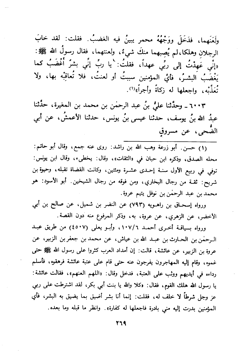 6003 - وَحَدَّثَنَا عَلِيُّ بْنُ عَبْدِ الرَّحْمَنِ بْنِ مُحَمَّدِ بْنِ الْمُغِيرَةِ، حَدَّثَنَا عَبْدُ اللهِ بْنُ يُوسُفَ، حَدَّثَنَا عِيسَى بْنُ يُونُسَ، حَدَّثَنَا الْأَعْمَشُ، عَنْ أَبِي الضُّحَى، عَنْ مَسْرُوقٍ، -[270]- عَنْ عَائِشَةَ قَالَتْ: دَخَلَ عَلَى النَّبِيِّ صَلَّى اللَّهُ عَلَيْهِ وَسَلَّمَ رَجُلَانِ، فَخَلَوْا بِهِ، فَسَبَّهُمَا وَلَعَنَهُمَا، وَأَخْرَجَهُمَا، فَقُلْتُ: يَا رَسُولَ اللهِ، مَا أَصَابَ مِنْكَ خَيْرًا، كَمَا أَصَابَهُ هَذَانِ، قَالَ: " أَوَمَا عَلِمْتِ مَا شَارَطْتُ عَلَيْهِ رَبِّي عَزَّ وَجَلَّ: قُلْتُ اللهُمَّ إِنَّمَا أَنَا بَشَرٌ، فَأَيُّمَا رَجُلٍ مِنَ الْمُسْلِمِينَ سَبَبْتُهُ، أَوْ لَعَنْتُهُ، فَاجْعَلْهَا لَهُ زَكَاةً وَأَجْرًا "