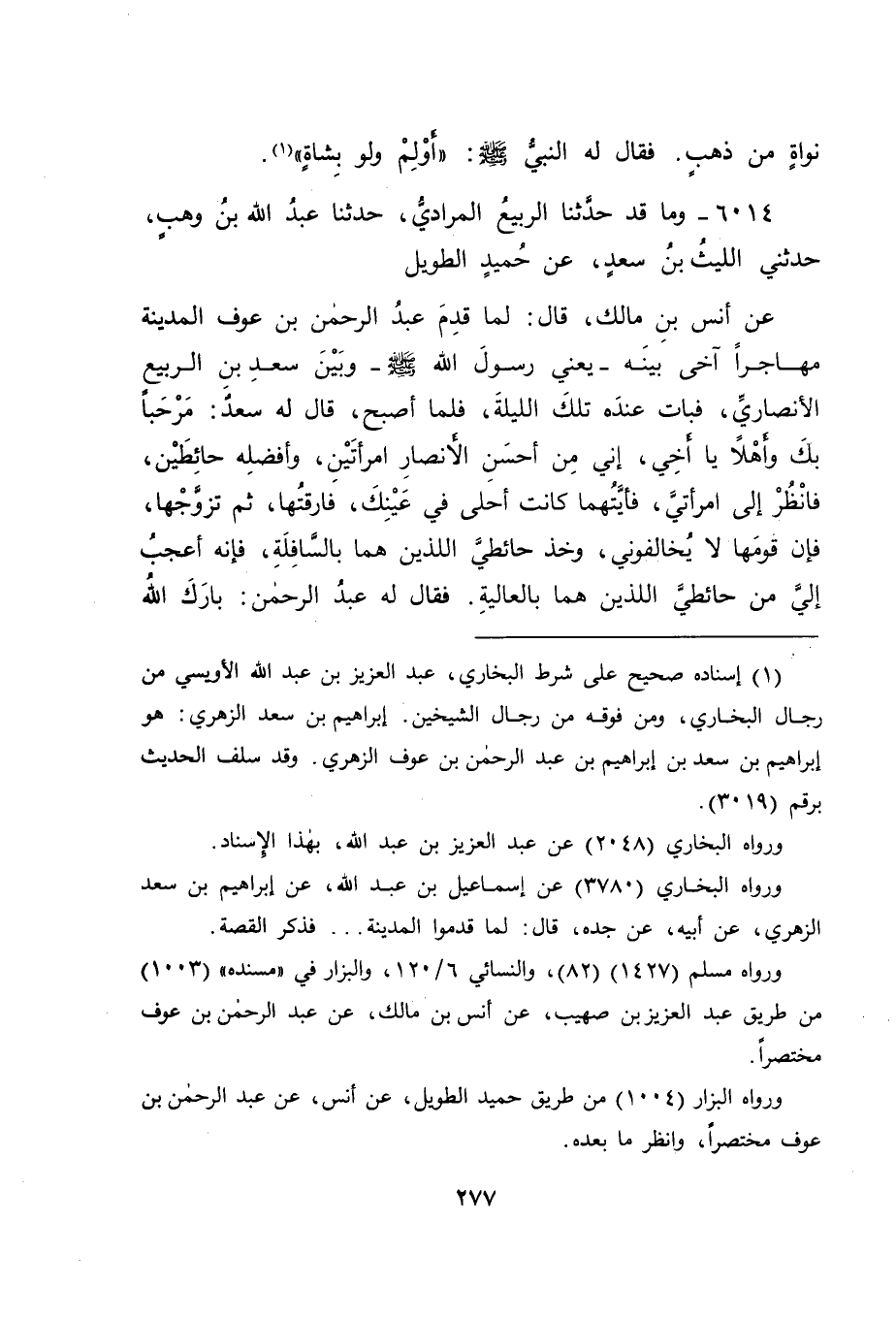 6014 - وَمَا قَدْ حَدَّثَنَا الرَّبِيعُ الْمُرَادُيُّ، حَدَّثَنَا عَبْدُ اللهِ بْنُ وَهْبٍ، حَدَّثَنِي اللَّيْثُ بْنُ سَعْدٍ، عَنْ حُمَيْدٍ الطَّوِيلِ، عَنْ أَنَسِ بْنِ مَالِكٍ قَالَ: لَمَّا قَدِمَ عَبْدُ الرَّحْمَنِ بْنُ عَوْفٍ الْمَدِينَةَ مُهَاجِرًا آخَى بَيْنَهُ , - يَعْنِي رَسُولُ اللهِ صَلَّى اللَّهُ عَلَيْهِ وَسَلَّمَ -، وَبَيْنَ سَعْدِ بْنِ الرَّبِيعِ الْأَنْصَارِيِّ، فَبَاتَ عِنْدَهُ تِلْكَ اللَّيْلَةَ، فَلَمَّا أَصْبَحَ، قَالَ لَهُ سَعْدٌ: مَرْحَبًا بِكَ وَأَهْلًا يَا أَخِي، إِنِّي مِنْ أَحْسَنِ الْأَنْصَارِ امْرَأَتَيْنِ، وَأَفْضَلِهِ حَائِطَيْنِ، فَانْظُرْ إِلَى امْرَأَتَيَّ، فَأَيَّتُهُمَا كَانَتْ أَحْلَى فِي عَيْنِكَ، فَارَقْتُهَا، ثُمَّ تَزَوَّجْهَا، فَإِنَّ قَوْمَهَا لَا يُخَالِفُونِي، وَخُذْ حَائِطَيَّ اللَّذَيْنِ هُمَا بِالسَّافِلَةِ، فَإِنَّهُ أَعْجَبُ إِلَيَّ مِنْ حَائِطَيَّ اللَّذَيْنِ هُمَا بِالْعَالِيَةِ، فَقَالَ لَهُ عَبْدُ الرَّحْمَنِ: " بَارَكَ اللهُ -[278]- لَكَ فِي أَهْلِكَ، وَمَالِكَ، أَرْشِدْنِي إِلَى السُّوقِ " فَذَهَبَ إِلَى السُّوقِ، فَانْقَلَبَ مِنْهُ بِنِصْفِ مُدٍّ رِبْحًا، ثُمَّ جَعَلَ يَخْتَلِفُ إِلَى السُّوقِ، حَتَّى كَسَبَ زِنَةَ نَوَاةٍ مِنْ ذَهَبٍ، فَتَزَوَّجَ بِهَا امْرَأَةً، ثُمَّ أَتَى رَسُولَ اللهِ صَلَّى اللَّهُ عَلَيْهِ وَسَلَّمَ، فَقَالَ: " تَزَوَّجْتَ؟ " قَالَ: نَعَمْ، يَا رَسُولَ اللهِ، قَالَ: " كَمْ سُقْتَ إِلَيْهَا؟ " قَالَ: زِنَةَ نَوَاةٍ مِنْ ذَهَبٍ، قَالَ: " أَوْلِمْ بِشَاةٍ " فَكَانَ قَوْلُ سَعْدٍ لِعَبْدِ الرَّحْمَنِ: أَيَّ زَوْجَتَيَّ هَوَيْتَ نَزَلْتُ لَكَ عَنْهَا، -[279]- لَمْ يَكُنْ ذَلِكَ عَلَى زَوْجَتَيْهِ جَمِيعًا , وَإِنَّمَا كَانَ عَلَى إِحْدَاهُمَا، فَمِثْلُ ذَلِكَ قَوْلُ الرَّجُلِ: أَعْتِقْ أَيَّ عَبِيدِي شِئْتَ، يَكُونُ ذَلِكَ عَلَى وَاحِدٍ مِنْ عَبِيدِهِ، لَا عَلَى جَمِيعِهِمْ. فَاحْتَجْنَا إِلَى حُكْمِ الْوُقُوفِ عَلَى حُكْمِ (أَيِّ) فِي هَذَيْنِ الْمَعْنَيَيْنِ اللَّذَيْنِ ذَكَرْنَاهُمَا، فَكَانَتْ فِي الْآثَارِ الَّتِي بَدَأْنَا بِذِكْرِهَا فِي هَذَا الْبَابِ عَلَى مَنْ لَا يُحْصَى عَدَدُهُ، وَلَا يُوقَفُ عَلَى عَدَدِهِ، وَلَا يَتَهَيَّأُ اسْتِعْمَالُهَا فِي أَهْلِهِ، حَتَّى لَا يَبْقَى مِنْهُمْ أَحَدٌ، وَكَانَتْ فِي الْفَصْلِ الثَّانِي مِنْهُمَا عَلَى مَا عَدَدُهُ مَعْلُومٌ، وَعَلَى مَا قَائِلُهَا فِيهِ قَادِرٌ عَلَى جَمِيعِهِ، فَعَقَلْنَا بِذَلِكَ: أَنَّهَا عَلَى مَا لَا يُحْصَى عَدَدُهُ، وَعَلَى مَا لَا يَقْدِرُ عَلَى الْإِتْيَانِ عَلَى كُلِّهِ يَكُونُ عَلَى مَا اسْتُعْمِلَتْ مِمَّا اسْتَعْمَلَهَا الْمَقُولُ لَهُ عَلَى مَا قِيلَتْ لَهُ، وَأَنَّهَا فِيمَا يُحْصَى عَدَدُهُ، وَيُوقَفُ عَلَى مِقْدَارِهِ، فَيَكُونُ عَلَى وَاحِدٍ مِنَ الْجِنْسِ الْمَذْكُورِ فِيهِ، لَا عَلَى أَكْثَرَ مِنْ ذَلِكَ، كَمَا قَالَ مُحَمَّدُ بْنُ الْحَسَنِ فِيهِ، وَبِاللهِ التَّوْفِيقُ.