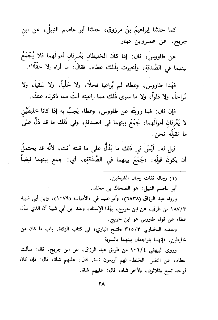 كَمَا حَدَّثَنَا إِبْرَاهِيمُ بْنُ مَرْزُوقٍ، حَدَّثَنَا أَبُو عَاصِمٍ النَّبِيلُ، عَنِ ابْنِ جُرَيْجٍ، عَنْ عَمْرِو بْنِ دِينَارٍ، عَنْ طَاوُسٍ قَالَ: " إِذَا كَانَ الْخَلِيطَانِ يَعْرِفَانِ أَمْوَالَهُمَا فَلَا يُجْمَعُ بَيْنَهُمَا فِي الصَّدَقَةِ " وَأَخْبَرْتُ بِذَلِكَ عَطَاءً فَقَالَ: مَا أُرَاهُ إِلَّا حَقًّا. فَهَذَا طَاوُسٌ، وَعَطَاءٌ لَمْ يُرَاعِيَا فَحْلًا، وَلَا حَلْبًا، وَلَا سَقْيًا، وَلَا مُرَاحًا، وَلَا دَلْوًا، وَلَا مَا سِوَى ذَلِكَ مِمَّا رَاعَيْتَهُ أَنْتَ مِمَّا ذَكَرْنَاهُ عَنْكَ. فَإِنْ قَالَ: فَمَا رَوَيْتَهُ عَنْ طَاوُسٍ، وَعَطَاءٍ يَجِبُ بِهِ إِذَا كَانَا خَلِيطَيْنِ لَا يَعْرِفَانِ أَمْوَالَهُمَا، جُمِعَ بَيْنَهُمَا فِي الصَّدَقَةِ، وَفِي ذَلِكَ مَا قَدْ دَلَّ عَلَى مَا نَقُولُهُ نَحْنُ. قِيلَ لَهُ: لَيْسَ فِي ذَلِكَ مَا يَدُلُّ عَلَى مَا قُلْتَهُ أَنْتَ؛ لِأَنَّهُ قَدْ يَحْتَمِلُ أَنْ يَكُونَ قَوْلُهُ: " جَمَعَ بَيْنَهُمَا فِي الصَّدَقَةِ " أَيْ: جَمَعَ بَيْنَهُمَا قَبْضًا -[29]- حَتَّى يُؤْخَذَا أَخْذًا وَاحِدًا، ثُمَّ يَتَرَاجَعَانِ بَيْنَهُمَا فِي الْمَأْخُوذِ مِنْهُمَا كَمَا يَقُولُ مُخَالِفُكَ فِيهِ، وَبِاللهِ التَّوْفِيقُ
