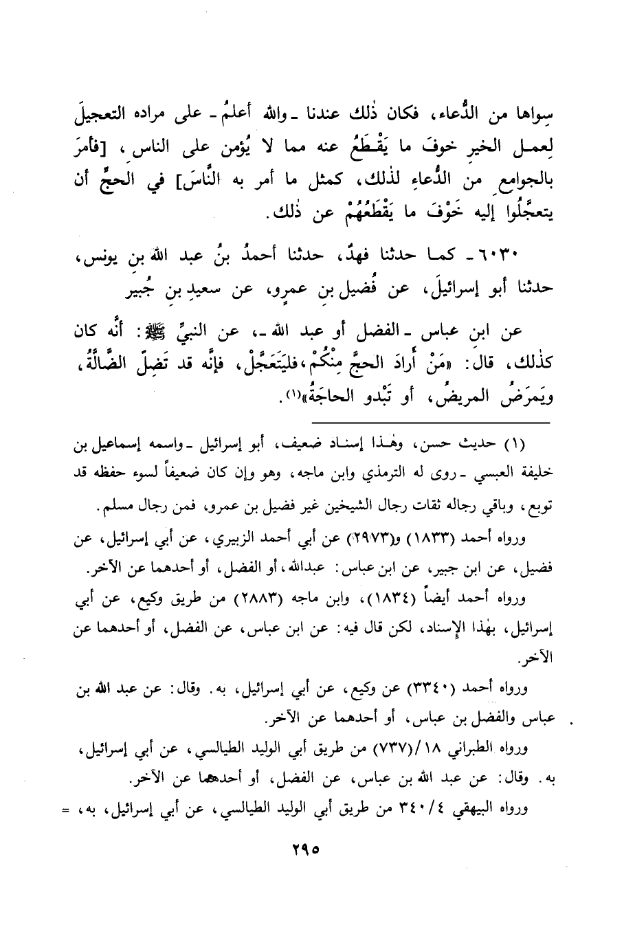 6030 - كَمَا حَدَّثَنَا فَهْدٌ، حَدَّثَنَا أَحْمَدُ بْنُ عَبْدِ اللهِ بْنِ يُونُسَ، حَدَّثَنَا أَبُو إِسْرَائِيلَ، عَنْ فُضَيْلِ بْنِ عَمْرٍو، عَنْ سَعِيدِ بْنِ جُبَيْرٍ، عَنِ ابْنِ عَبَّاسٍ الْفَضْلِ، أَوْ عَبْدِ اللهِ -، عَنِ النَّبِيِّ صَلَّى اللَّهُ عَلَيْهِ وَسَلَّمَ: أَنَّهُ كَانَ كَذَلِكَ، قَالَ: " مَنْ أَرَادَ الْحَجَّ مِنْكُمْ، فَلْيَتَعَجَّلْ، فَإِنَّهُ قَدْ تَضِلُّ الضَّالَّةُ، وَيَمْرَضُ الْمَرِيضُ، أَوْ تَبْدُو الْحَاجَةُ "