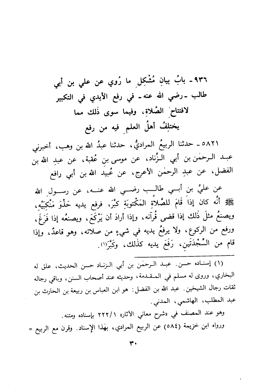 بَابُ بَيَانِ مُشْكِلِ مَا رُوِيَ عَنْ عَلِيِّ بْنِ أَبِي طَالِبٍ رَضِيَ اللهُ عَنْهُ فِي رَفْعِ الْأَيْدِي فِي التَّكْبِيرِ لِافْتِتَاحِ الصَّلَاةِ، وَفِيمَا سِوَى ذَلِكَ مِمَّا يَخْتَلِفُ أَهْلُ الْعِلْمِ فِيهِ مِنْ رَفْعٍ