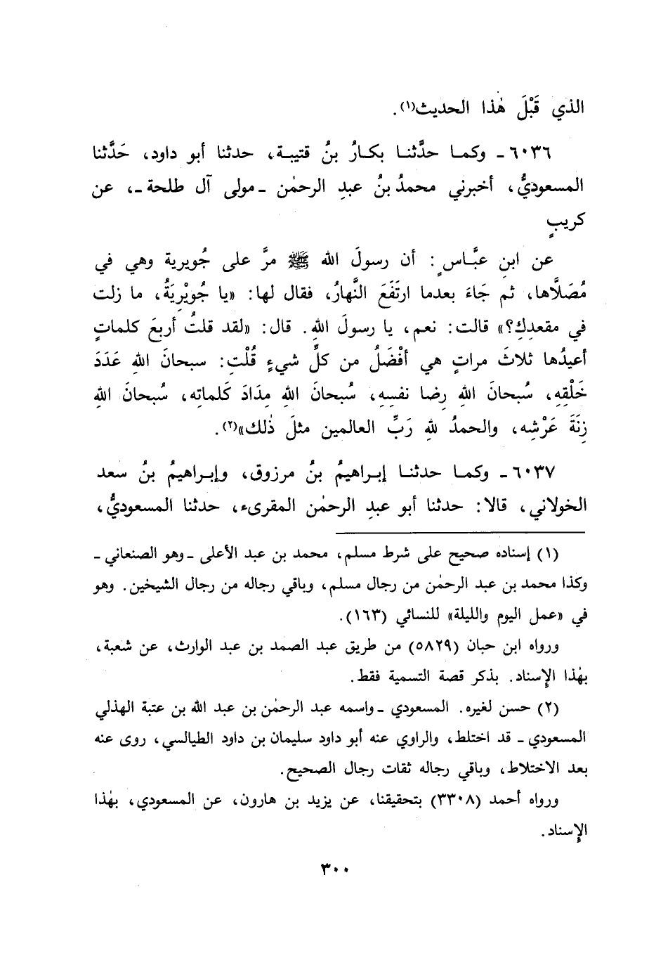6036 - وَكَمَا حَدَّثَنَا بَكَّارُ بْنُ قُتَيْبَةَ، حَدَّثَنَا أَبُو دَاوُدَ، حَدَّثَنَا الْمَسْعُودِيُّ، أَخْبَرَنِي مُحَمَّدُ بْنُ عَبْدِ الرَّحْمَنِ، مَوْلَى آلِ طَلْحَةَ، عَنْ كُرَيْبٍ، عَنِ ابْنِ عَبَّاسٍ، أَنَّ رَسُولَ اللهِ صَلَّى اللَّهُ عَلَيْهِ وَسَلَّمَ مَرَّ عَلَى جُوَيْرِيَةَ، وَهِيَ فِي مُصَلَّاهَا، ثُمَّ جَاءَ بَعْدَمَا ارْتَفَعَ النَّهَارُ، فَقَالَ لَهَا: " يَا جُوَيْرِيَةُ، مَا زِلْتِ فِي مَقْعَدِكِ؟ " قَالَتْ: نَعَمْ يَا رَسُولَ اللهِ، قَالَ: " لَقَدْ قُلْتُ أَرْبَعَ كَلِمَاتٍ أُعِيدُهَا ثَلَاثَ مَرَّاتٍ هِيَ أَفْضَلُ مِنْ كُلِّ شَيْءٍ، قُلْتُ: سُبْحَانَ اللهِ عَدَدَ خَلْقِهِ، سُبْحَانَ اللهِ رِضَا نَفْسِهِ، سُبْحَانَ اللهِ مِدَادَ كَلِمَاتِهِ، سُبْحَانَ اللهِ زِنَةَ عَرْشِهِ، وَالْحَمْدُ لِلَّهِ رَبِّ الْعَالَمِينَ مِثْلَ ذَلِكَ "