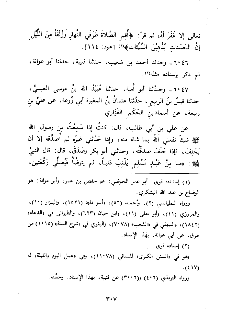 6047 - وَحَدَّثَنَا أَبُو أُمَيَّةَ، حَدَّثَنَا عُبَيْدُ اللهِ بْنُ مُوسَى الْعَبْسِيُّ، حَدَّثَنَا قَيْسُ بْنُ الرَّبِيعِ، حَدَّثَنَا عُثْمَانُ بْنُ الْمُغِيرَةِ أَبِي زُرْعَةَ، عَنْ عَلِيِّ بْنِ رَبِيعَةَ، عَنْ أَسْمَاءِ بْنِ الْحَكَمِ الْفَزَارِيِّ، عَنْ عَلِيِّ بْنِ أَبِي طَالِبٍ قَالَ: كُنْتُ إِذَا سَمِعْتُ مِنْ رَسُولِ اللهِ صَلَّى اللَّهُ عَلَيْهِ وَسَلَّمَ شَيْئًا نَفَعَنِي اللهُ بِمَا شَاءَ مِنْهُ، وَإِذَا حَدَّثَنِي غَيْرُهُ لَمْ أُصَدِّقْهُ، إِلَّا أَنْ يَحْلِفَ، فَإِذَا حَلَفَ صَدَّقْتُهُ، وَحَدَّثَنِي أَبُو بَكْرٍ وَصَدَقَ قَالَ: قَالَ النَّبِيُّ صَلَّى اللَّهُ عَلَيْهِ وَسَلَّمَ: " مَا مِنْ عَبْدٍ مُسْلِمٍ يُذْنِبُ ذَنْبًا، ثُمَّ يَتَوَضَّأُ، فَيُصَلِّي رَكْعَتَيْنِ، -[308]- فَيَسْتَغْفِرُ اللهَ تَعَالَى، إِلَّا غَفَرَ لَهُ "