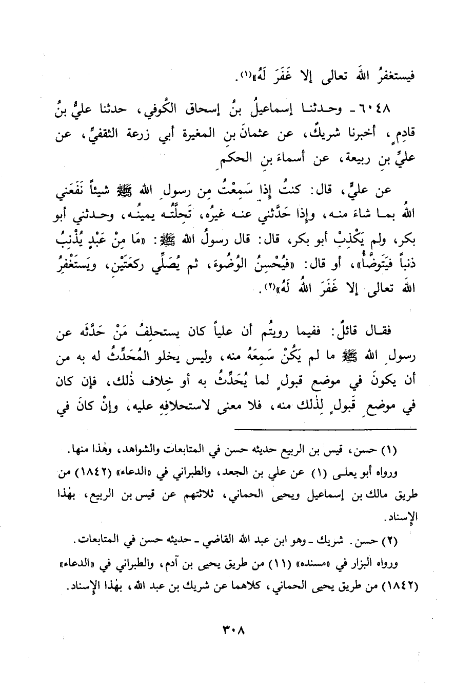 6048 - وَحَدَّثَنَا إِسْمَاعِيلُ بْنُ إِسْحَاقَ الْكُوفِيُّ، حَدَّثَنَا عَلِيُّ بْنُ قَادِمٍ، أَخْبَرَنَا شَرِيكٌ، عَنْ عُثْمَانَ بْنِ الْمُغِيرَةِ أَبِي زُرْعَةَ الثَّقَفِيِّ، عَنْ عَلِيِّ بْنِ رَبِيعَةَ، عَنْ أَسْمَاءِ بْنِ الْحَكَمِ، عَنْ عَلِيٍّ قَالَ: كُنْتُ إِذَا سَمِعْتُ مِنْ رَسُولِ اللهِ صَلَّى اللَّهُ عَلَيْهِ وَسَلَّمَ شَيْئًا نَفَعَنِي اللهُ بِمَا شَاءَ مِنْهُ، وَإِذَا حَدَّثَنِي عَنْهُ غَيْرُهُ، تَحِلَّتُهُ يَمِينُهُ، وَحَدَّثَنِي أَبُو بَكْرٍ وَلَمْ يَكْذِبْ أَبُو بَكْرٍ، قَالَ: قَالَ رَسُولُ اللهِ صَلَّى اللَّهُ عَلَيْهِ وَسَلَّمَ: " مَا مِنْ عَبْدٍ يُذْنِبِ ذَنْبًا، فَيَتَوَضَّأُ "، أَوْ قَالَ: " فَيُحْسِنُ الْوُضُوءَ، ثُمَّ يُصَلِّي رَكْعَتَيْنِ، وَيَسْتَغْفِرُ اللهَ تَعَالَى، إِلَّا غَفَرَ اللهُ لَهُ " فَقَالَ قَائِلٌ: فَفِيمَا رَوَيْتُمْ أَنَّ عَلِيًّا كَانَ يَسْتَحْلِفُ مَنْ حَدَّثَهُ عَنْ رَسُولِ اللهِ صَلَّى اللَّهُ عَلَيْهِ وَسَلَّمَ , مَا لَمْ يَكُنْ سَمِعَهُ مِنْهُ، وَلَيْسَ يَخْلُو الْمُحَدِّثُ لَهُ بِهِ مِنْ أَنْ يَكُونَ فِي مَوْضِعِ قَبُولٍ لِمَا يُحَدِّثُ بِهِ، أَوْ خِلَافَ ذَلِكَ، فَإِنْ كَانَ فِي مَوْضِعِ قَبُولٍ لِذَلِكَ مِنْهُ، فَلَا مَعْنَى لِاسْتِحْلَافِهِ عَلَيْهِ، وَإِنْ كَانَ فِي -[309]- غَيْرِ مَوْضِعِ قَبُولٍ لِذَلِكَ مِنْهُ، فَلَا مَعْنَى لِلتَّشَاغُلِ فِيمَا يُحَدِّثُ بِهِ، إِذْ كَانَ لَيْسَ فِي مَوْضِعٍ يُوجِبُ أَخْذَ ذَلِكَ عَنْهُ. فَكَانَ جَوَابُنَا لَهُ فِي ذَلِكَ: أَنَّ مَذْهَبَ عَلِيٍّ كَانَ فِي الْبَيِّنَةِ الشَّاهِدَةِ فِي الْحُقُوقِ الثَّابِتِ عَدْلُهَا أَنَّهُ لَا يَحْكُمُ بِهَا فِيهَا، إِلَّا بَعْدَ حَلِفِ الْمَشْهُودِ لَهُ عَلَى صِدْقِهَا فِيمَا شَهِدْتَ لَهُ بِهِ