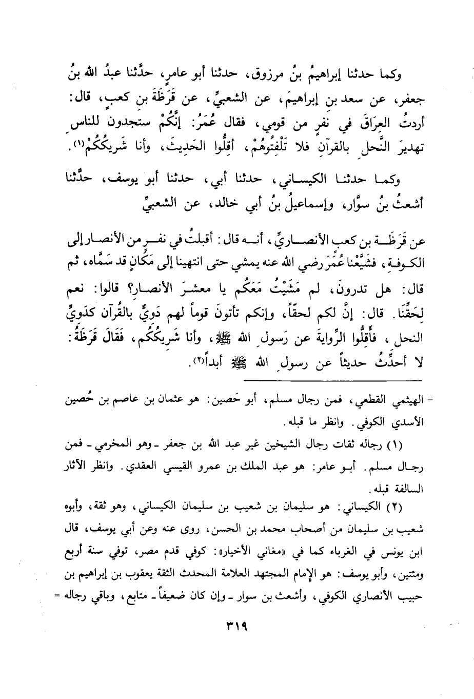 وَكَمَا حَدَّثَنَا الْكَيْسَانِيُّ، حَدَّثَنَا أَبِي، حَدَّثَنَا أَبُو يُوسُفَ، حَدَّثَنَا أَشْعَثُ بْنُ سَوَّارٍ، وَإِسْمَاعِيلُ بْنُ أَبِي خَالِدٍ، عَنِ الشَّعْبِيِّ، عَنْ قَرَظَةَ بْنِ كَعْبٍ الْأَنْصَارِيِّ أَنَّهُ قَالَ: أَقْبَلْتُ فِي نَفَرٍ مِنَ الْأَنْصَارِ إِلَى الْكُوفَةِ، فَشَيَّعَنَا عُمَرُ رَضِيَ اللهُ عَنْهُ يَمْشِي، حَتَّى انْتَهَيْنَا إِلَى مَكَانٍ قَدْ سَمَّاهُ، ثُمَّ قَالَ: " هَلْ تَدْرُونَ، لِمَ مَشَيْتُ مَعَكُمْ يَا مَعْشَرَ الْأَنْصَارِ؟ قَالُوا: نَعَمْ لِحَقِّنَا قَالَ: إِنَّ لَكُمْ لَحَقًّا، وَإِنَّكُمْ تَأْتُونَ قَوْمًا لَهُمْ دَوِيُّ بِالْقُرْآنِ، كَدَوِيِّ النَّحْلِ، فَأَقِلُّوا الرِّوَايَةَ عَنْ رَسُولِ اللهِ صَلَّى اللَّهُ عَلَيْهِ وَسَلَّمَ، وَأَنَا شَرِيكُكُمْ " فَقَالَ قَرَظَةُ: لَا أُحَدِّثُ حَدِيثًا عَنْ رَسُولِ اللهِ صَلَّى اللَّهُ عَلَيْهِ وَسَلَّمَ أَبَدًا -[320]- قَالَ أَبُو جَعْفَرٍ: فَدُلَّ هَذَا الْحَدِيثُ عَلَى أَنَّ عُمَرَ إِنَّمَا أَرَادَ بِمَا أَرَادَ مِمَّا فِي الْأَحَادِيثِ الْأُوَلِ، أَنْ لَا يَقْطَعُوا النَّاسَ عَنْ كِتَابِ اللهِ عَزَّ وَجَلَّ بِمَا يُحَدِّثُونَهُمْ بِهِ عَنْ رَسُولِ اللهِ صَلَّى اللَّهُ عَلَيْهِ وَسَلَّمَ، وَفِي ذَلِكَ مَا قَدْ دَلَّ أَنَّهُ إِنَّمَا كَرِهَ مِنْهُمْ هَذَا الْمَعْنَى لَا مَا سِوَاهُ مِمَّا يَجْمَعُونَ بِهِ التَّشَاغُلَ بِكِتَابِ اللهِ عَزَّ وَجَلَّ، وَالْحَدِيثُ عَنْ رَسُولِ اللهِ صَلَّى اللَّهُ عَلَيْهِ وَسَلَّمَ الَّذِي يَسْتَدِلُّونَ بِهِ عَلَى مَعَانِي كِتَابِ اللهِ، لَا بِمَا يَقْطَعُونَ بِهِ عَنْ كِتَابِ اللهِ عَزَّ وَجَلَّ