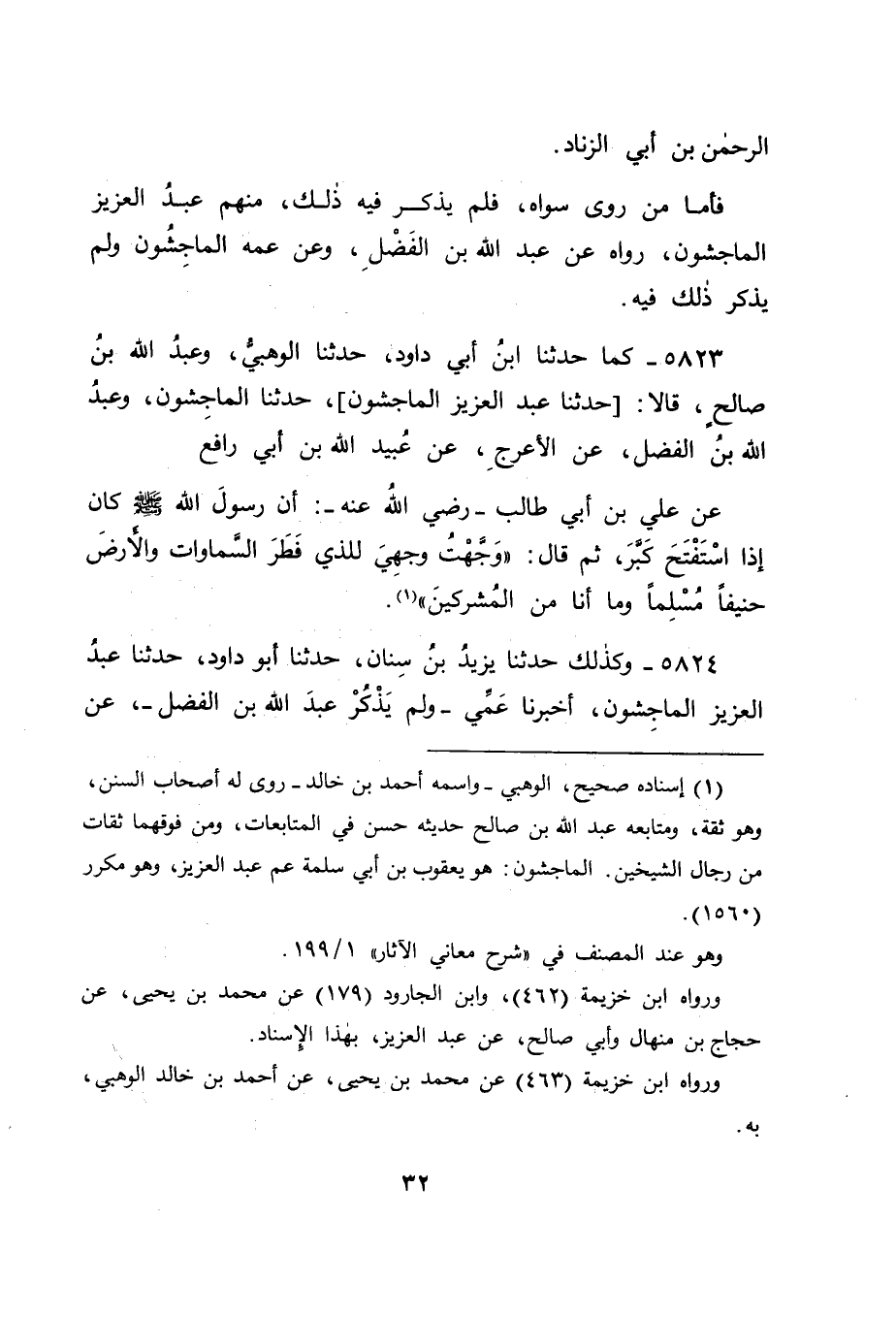 5823 - كَمَا حَدَّثَنَا ابْنُ أَبِي دَاوُدَ، حَدَّثَنَا الْوَهْبِيُّ، وَعَبْدُ اللهِ بْنُ صَالِحٍ، قَالَا: حَدَّثَنَا عَبْدُ الْعَزِيزِ الْمَاجِشُونُ، حَدَّثَنَا الْمَاجِشُونُ، وَعَبْدُ اللهِ بْنُ الْفَضْلِ، عَنِ الْأَعْرَجِ، عَنْ عُبَيْدِ اللهِ بْنِ أَبِي رَافِعٍ، عَنْ عَلِيِّ بْنِ أَبِي طَالِبٍ رَضِيَ اللهُ عَنْهُ: " أَنَّ رَسُولَ اللهِ صَلَّى اللَّهُ عَلَيْهِ وَسَلَّمَ كَانَ إِذَا اسْتَفْتَحَ كَبَّرَ، ثُمَّ قَالَ: " {وَجَّهْتُ وَجْهِيَ لِلَّذِي فَطَرَ السَّمَوَاتِ وَالْأَرْضَ حَنِيفًا مُسْلِمًا وَمَا أَنَا مِنَ الْمُشْرِكِينَ}