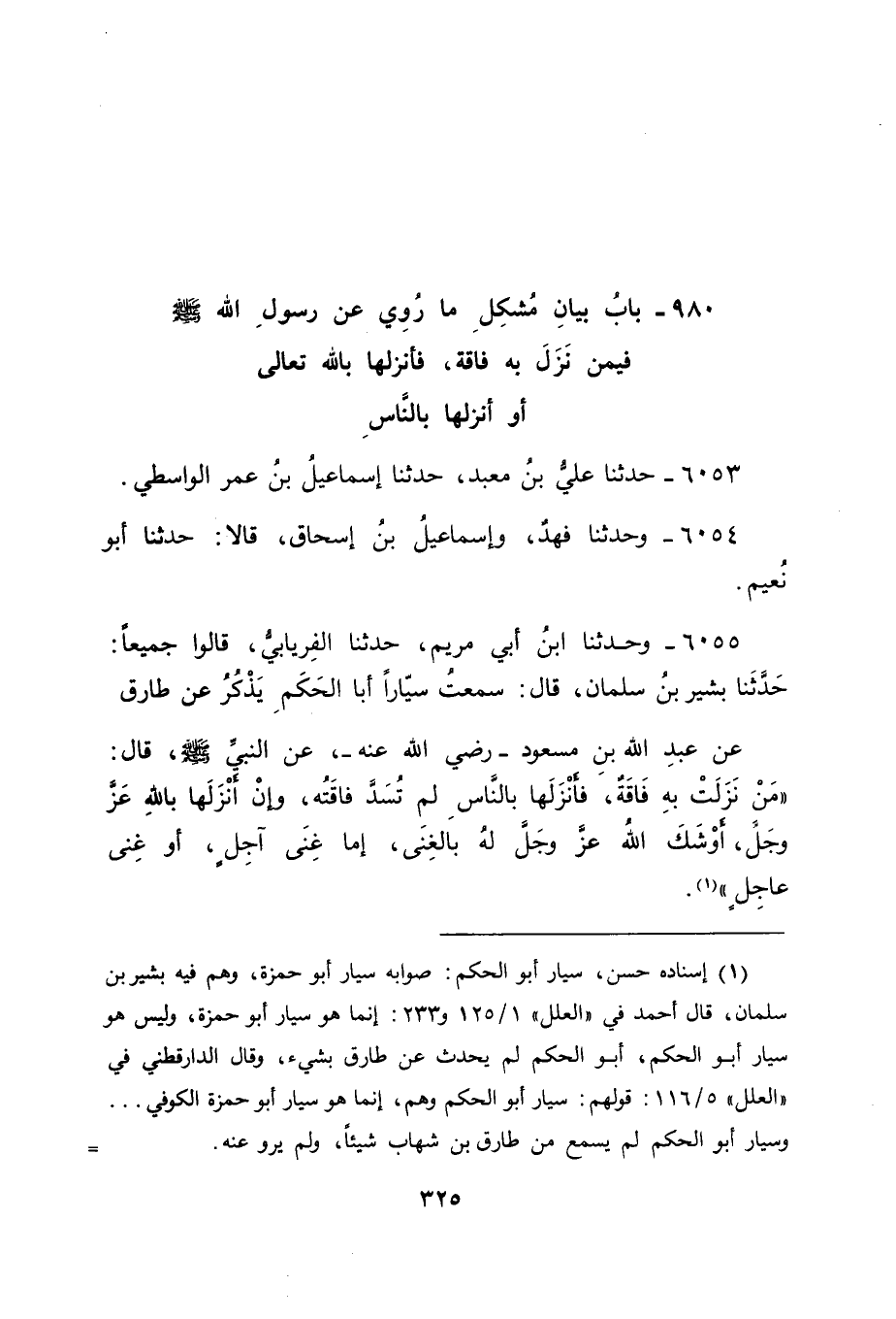 6055 - وَحَدَّثَنَا ابْنُ أَبِي مَرْيَمَ، حَدَّثَنَا الْفِرْيَابِيُّ، قَالُوا جَمِيعًا: حَدَّثَنَا بَشِيرُ بْنُ سَلْمَانَ قَالَ: سَمِعْتُ سَيَّارًا أَبَا الْحَكَمِ، يَذْكُرُ عَنْ طَارِقٍ، عَنْ عَبْدِ اللهِ بْنِ مَسْعُودٍ، رَضِيَ اللهُ عَنْهُ، عَنْ النَّبِيِّ صَلَّى اللَّهُ عَلَيْهِ وَسَلَّمَ قَالَ: " مَنْ نَزَلَتْ بِهِ فَاقَةٌ، فَأَنْزَلَهَا بِالنَّاسِ لَمْ تُسَدَّ فَاقَتُهُ، وَإِنْ أَنْزَلَهَا بِاللهِ عَزَّ وَجَلَّ، أَوْشَكَ اللهُ عَزَّ وَجَلَّ لَهُ بِالْغِنَى، إِمَّا غِنًى آجِلٍ، أَوْ غِنًى عَاجِلٍ " -[326]- قَالَ أَبُو جَعْفَرٍ رَحِمَهُ اللهُ: فَكَانَ فِي الْحَدِيثِ أَنَّ الْغِنَىَ الْآجِلَ الَّذِي يُغْنِي عَنِ الدُّنْيَا قَدْ جَعَلَهُ رَسُولُ اللهِ صَلَّى اللَّهُ عَلَيْهِ وَسَلَّمَ غِنًى بِمَعْنَى غِنًى الْمَالِ، وَكَانَ قَوْلُهُ: " أَوْ غِنًى عَاجِلٍ " الَّذِي لَا يُلْهِي عَنْ ذِكْرِ اللهِ عَزَّ وَجَلَّ، وَأَدَاءِ فَرَائِضِهِ، وَالْقِيَامِ فِيهِ بِحَقِّهِ، وَيَكُونُ مَعَ ذَلِكَ قِوَامًا لِلَّذِي يُؤْتَاهُ فِي دُنْيَاهُ، حَتَّى يَكُونَ فَارِغًا لِتِلْكَ الْأَشْيَاءِ الْأُخَرِ، وَبِاللهِ التَّوْفِيقُ