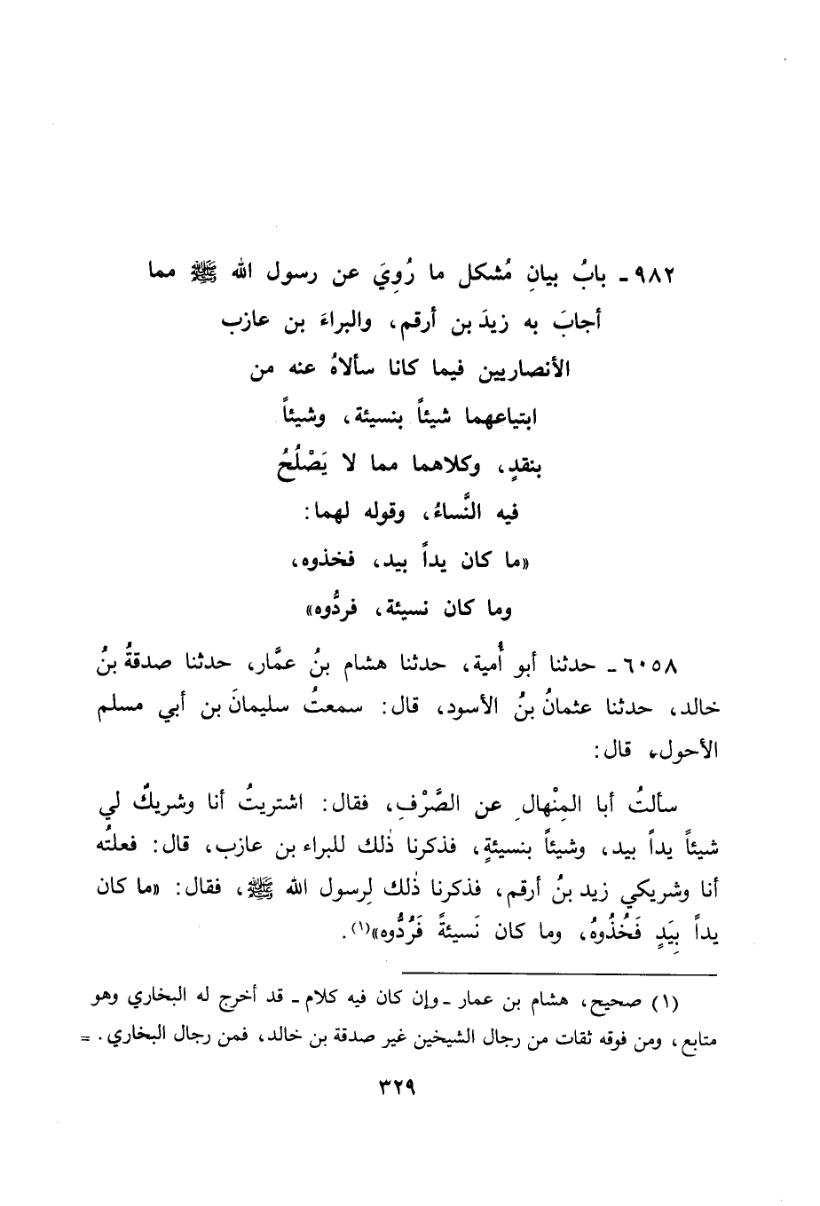 بَابُ بَيَانِ مُشْكِلِ مَا رُوِيَ عَنْ رَسُولِ اللهِ صَلَّى اللَّهُ عَلَيْهِ وَسَلَّمَ مِمَّا أَجَابَ بِهِ زَيْدَ بْنَ أَرْقَمَ، وَالْبَرَاءَ بْنَ عَازِبٍ الْأَنْصَارِيَّيْنِ فِيمَا كَانَا سَأَلَاهُ عَنْهُ مِنَ ابْتِيَاعِهِمَا شَيْئًا بِنَسِيئَةٍ، وَشَيْئًا بِنَقْدٍ، وَكِلَاهُمَا مِمَّا لَا يَصْلُحُ فِيهِ النِّسَاءُ وَقَوْلِهِ لَهُمَا: " مَا كَانَ يَدًا بِيَدٍ، فَخُذُوهُ، وَمَا كَانَ نَسِيئَةٍ، فَرُدُّوهُ "