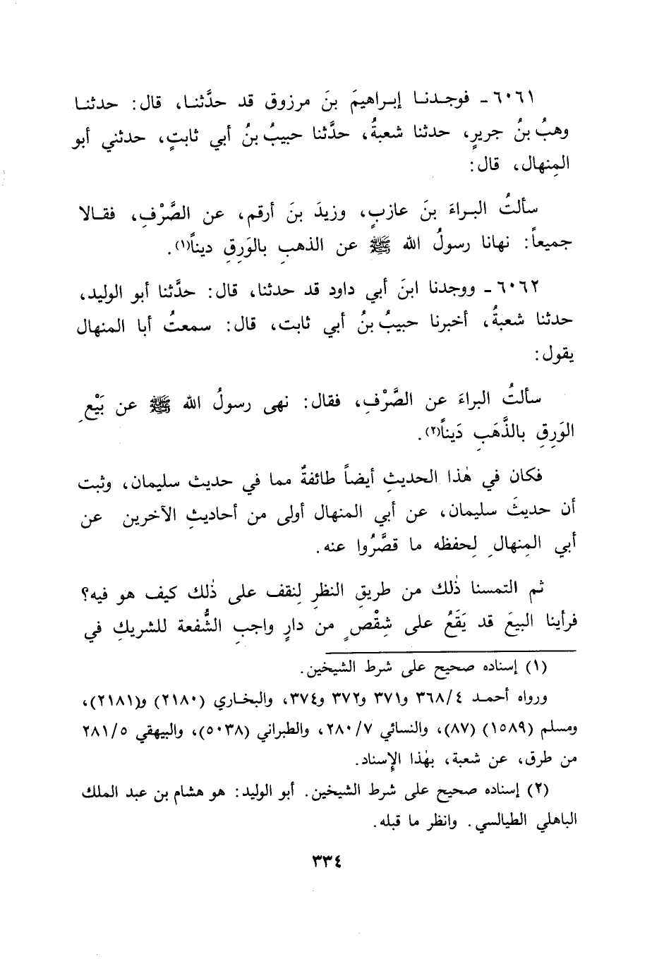 6061 - فَوَجَدْنَا إِبْرَاهِيمَ بْنَ مَرْزُوقٍ، قَدْ حَدَّثَنَا قَالَ: حَدَّثَنَا وَهْبُ بْنُ جَرِيرٍ، حَدَّثَنَا شُعْبَةُ، حَدَّثَنَا حَبِيبُ بْنُ أَبِي ثَابِتٍ، حَدَّثَنِي أَبُو الْمِنْهَالِ قَالَ: سَأَلْتُ الْبَرَاءَ بْنَ عَازِبٍ وَزَيْدَ بْنَ أَرْقَمَ عَنِ الصَّرْفِ فَقَالَا جَمِيعًا: نَهَانَا رَسُولُ اللهِ صَلَّى اللَّهُ عَلَيْهِ وَسَلَّمَ عَنِ الذَّهَبِ بِالْوَرِقِ دَيْنًا "