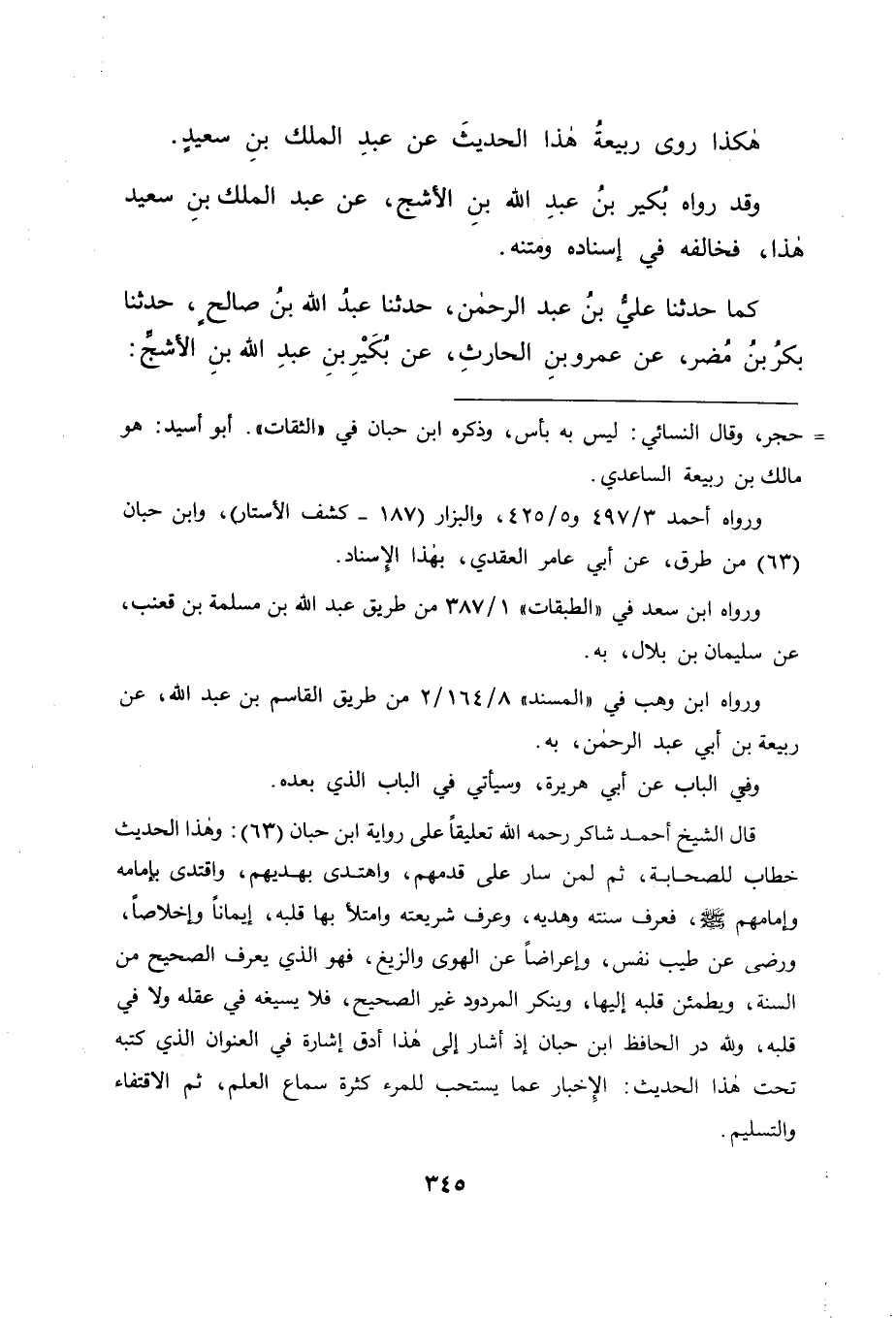 كَمَا حَدَّثَنَا عَلِيُّ بْنُ عَبْدِ الرَّحْمَنِ، حَدَّثَنَا عَبْدُ اللهِ بْنُ صَالِحٍ، حَدَّثَنَا بَكْرُ بْنُ مُضَرٍ، عَنْ عَمْرِو بْنِ الْحَارِثِ، عَنْ بُكَيْرِ بْنِ عَبْدِ اللهِ بْنِ الْأَشَجِّ: -[346]- أَنَّ عَبْدَ الْمَلِكِ بْنَ سَعِيدٍ، حَدَّثَهُ عَنْ عَبَّاسِ بْنِ سَهْلٍ: أَنَّ أُبَيَّ بْنَ كَعْبٍ كَانَ فِي مَجْلِسٍ، فَجَعَلُوا يَتَحَدَّثُونَ عَنْ رَسُولِ اللهِ صَلَّى اللَّهُ عَلَيْهِ وَسَلَّمَ بِالْمُرَخَّصِ وَالْمُشَدَّدِ، وَأُبَيُّ بْنُ كَعْبٍ سَاكِتٌ، فَلَمْ يَكُنْ غَيْرَ أَنْ قَالَ: أَيُّ هَؤُلَاءِ مَا حَدِيثٌ بَلَغَكُمْ عَنْ رَسُولِ اللهِ صَلَّى اللَّهُ عَلَيْهِ وَسَلَّمَ تَعْرِفُهُ الْقُلُوبُ، وَيَلِينُ لَهُ الْجِلْدُ، وَتَرْجُونَ عِنْدَهُ، فَصَدِّقُوا بِقَوْلِ رَسُولِ اللهِ صَلَّى اللَّهُ عَلَيْهِ وَسَلَّمَ، فَإِنَّ رَسُولَ اللهِ صَلَّى اللَّهُ عَلَيْهِ وَسَلَّمَ لَا يَقُولُ إِلَّا الْخَيْرَ " قَالَ أَبُو جَعْفَرٍ: فَتَأَمَّلْنَا هَذَا الْحَدِيثَ، فَوَجَدْنَا اللهَ عَزَّ وَجَلَّ قَالَ فِي كِتَابِهِ: {إِنَّمَا الْمُؤْمِنُونَ الَّذِينَ إِذَا ذُكِرَ اللهُ وَجِلَتْ قُلُوبُهُمْ، وَإِذَا تُلِيَتْ عَلَيْهِمْ آيَاتُهُ زَادَتْهُمْ إِيمَانًا} [الأنفال: 2] ، وَقَالَ عَزَّ وَجَلَّ: {اللهُ نَزَّلَ أَحْسَنَ الْحَدِيثِ كِتَابًا مُتَشَابِهًا مَثَانِيَ تَقْشَعِرُّ مِنْهُ جُلُودُ الَّذِينَ يَخْشَوْنَ رَبَّهُمْ، ثُمَّ تَلِينُ جُلُودُهُمْ، وَقُلُوبُهُمْ إِلَى ذِكْرِ اللهِ} [الزمر: 23] ، وَقَالَ عَزَّ وَجَلَّ فِيمَا ذَكَرَ عَنْ أَصْحَابِ النَّجَاشِيِّ: {وَإِذَا سَمِعُوا مَا أُنْزِلَ إِلَى الرَّسُولِ تَرَى أَعْيُنَهُمْ تَفِيضُ مِنَ الدَّمْعِ مِمَّا عَرَفُوا مِنَ الْحَقِّ يَقُولُونَ رَبَّنَا آمَنَّا} [المائدة: 83] ، فَأَخْبِرَ اللهُ عَزَّ وَجَلَّ عَنْ أَهْلِ الْإِيمَانِ مِنْ هَذِهِ الْأَحْوَالِ عِنْدَ السَّمَاعِ بِمَا أُنْزِلَ عَلَى نَبِيِّهِمْ صَلَّى اللَّهُ عَلَيْهِ وَسَلَّمَ، وَكَانَ مَا يُحَدِّثُونَ بِهِ عِنْدَهُ مِمَّا يَكُونُ فِي الْحَقِيقَةِ، كَمَا يُحَدِّثُونَ بِهِ عَنْهُ مِنْ جِنْسِ ذَلِكَ، لِأَنَّ ذَلِكَ كُلَّهُ مِنْ عِنْدِ اللهِ عَزَّ وَجَلَّ قَامَتْ عَلَيْهِ الْحُجَّةُ عِنْدَهُمْ بِصِدْقِ مَا يُحَدِّثُهُمْ بِهِ عَنْهُ، فَوَجَبَ عَلَيْهِمْ بِذَلِكَ الْوُقُوفِ عَلَى مَا حَدَّثَهُمْ بِهِ مِنْ ذَلِكَ قَبُولُ قَوْلِهِ، وَالْمُخَالَفَةُ بَيْنَهُ وَبَيْنَ مَا سِوَاهُ مِمَّا تَقَدَّمَ ذِكْرُنَا لَهُ قَبْلَهُ