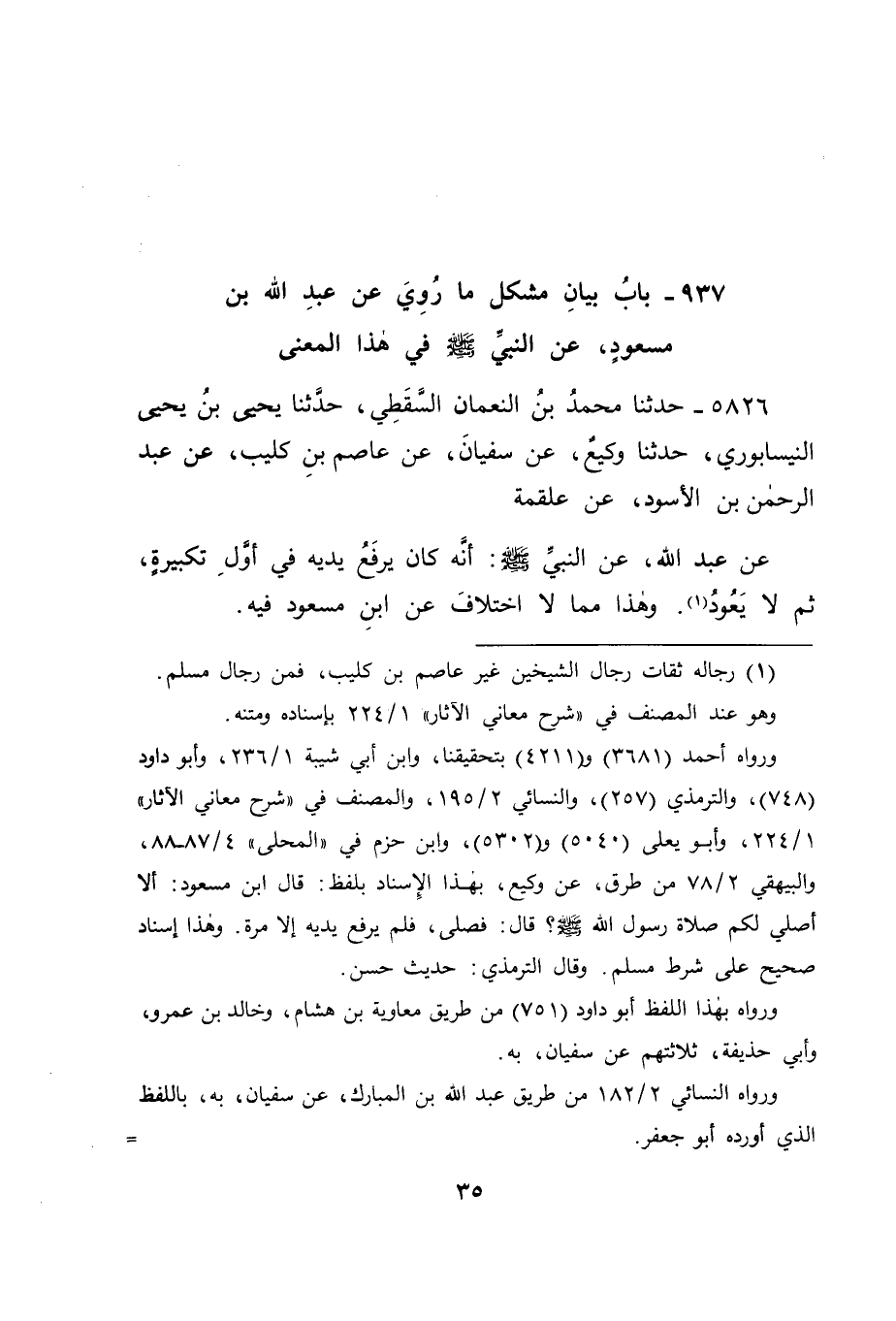 5826 - حَدَّثَنَا مُحَمَّدُ بْنُ النُّعْمَانِ السَّقَطِيُّ، حَدَّثَنَا يَحْيَى بْنُ يَحْيَى النَّيْسَابُورِيُّ، حَدَّثَنَا وَكِيعٌ، عَنْ سُفْيَانَ، عَنْ عَاصِمِ بْنِ كُلَيْبٍ، عَنْ عَبْدِ الرَّحْمَنِ بْنِ الْأَسْوَدِ، عَنْ عَلْقَمَةَ، عَنْ عَبْدِ اللهِ، عَنِ النَّبِيِّ صَلَّى اللَّهُ عَلَيْهِ وَسَلَّمَ: " أَنَّهُ كَانَ يَرْفَعُ يَدَيْهِ فِي أَوَّلِ تَكْبِيرَةٍ، ثُمَّ لَا يَعُودُ " وَهَذَا مِمَّا لَا اخْتِلَافَ عَنِ ابْنِ مَسْعُودٍ فِيهِ. -[37]- وَقَدْ وَافَقَ هَذَا الْحَدِيثَ عَنْ عَبْدِ اللهِ بْنِ مَسْعُودِ فِيهِ