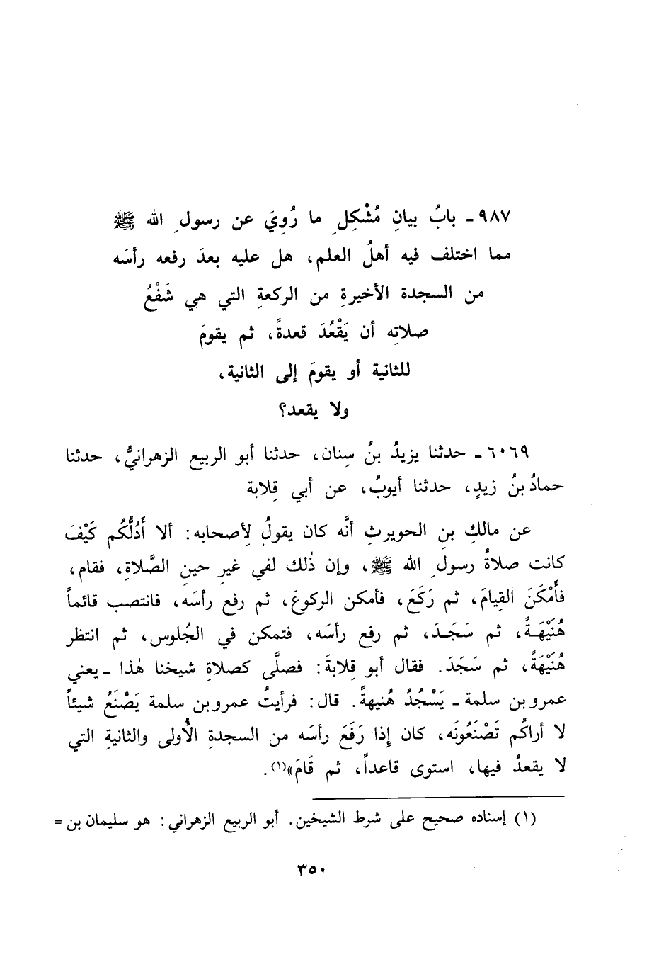 6069 - حَدَّثَنَا يَزِيدُ بْنُ سِنَانٍ، حَدَّثَنَا أَبُو الرَّبِيعِ الزَّهْرَانِيُّ، حَدَّثَنَا حَمَّادُ بْنُ زَيْدٍ، حَدَّثَنَا أَيُّوبُ، عَنْ أَبِي قِلَابَةَ، عَنْ مَالِكِ بْنِ الْحُوَيْرِثِ أَنَّهُ كَانَ يَقُولُ لِأَصْحَابِهِ: أَلَا أَدُلُّكُمْ كَيْفَ كَانَتْ صَلَاةُ رَسُولِ اللهِ صَلَّى اللَّهُ عَلَيْهِ وَسَلَّمَ، وَإِنَّ ذَلِكَ لَفِي غَيْرِ حِينِ الصَّلَاةِ، فَقَامَ، فَأَمْكَنَ الْقِيَامَ ثُمَّ رَكَعَ فَأَمْكَنَ الرُّكُوعَ، ثُمَّ رَفَعَ رَأْسَهُ، فَانْتَصَبَ قَائِمًا هُنَيْهَةً، ثُمَّ سَجَدَ، ثُمَّ رَفَعَ رَأْسَهُ، فَتَمَكَّنَ فِي الْجُلُوسِ، ثُمَّ انْتَظَرَ هُنَيْهَةَ، ثُمَّ سَجَدَ. فَقَالَ أَبُو قِلَابَةَ: فَصَلَّى كَصَلَاةِ شَيْخِنَا هَذَا، يَعْنِي عَمْرَو بْنَ سَلَمَةَ، يَسْجُدُ هُنَيْهَةً قَالَ: فَرَأَيْتُ عَمْرَو بْنَ سَلَمَةَ يَصْنَعُ شَيْئًا، لَا أَرَاكُمُ تَصْنَعُونَهُ، كَانَ إِذَا رَفَعَ رَأْسَهُ مِنَ السَّجْدَةِ الْأُولَى، وَالثَّانِيَةِ الَّتِي لَا يَقْعُدُ فِيهَا، اسْتَوَى قَاعِدًا، ثُمَّ قَامَ "