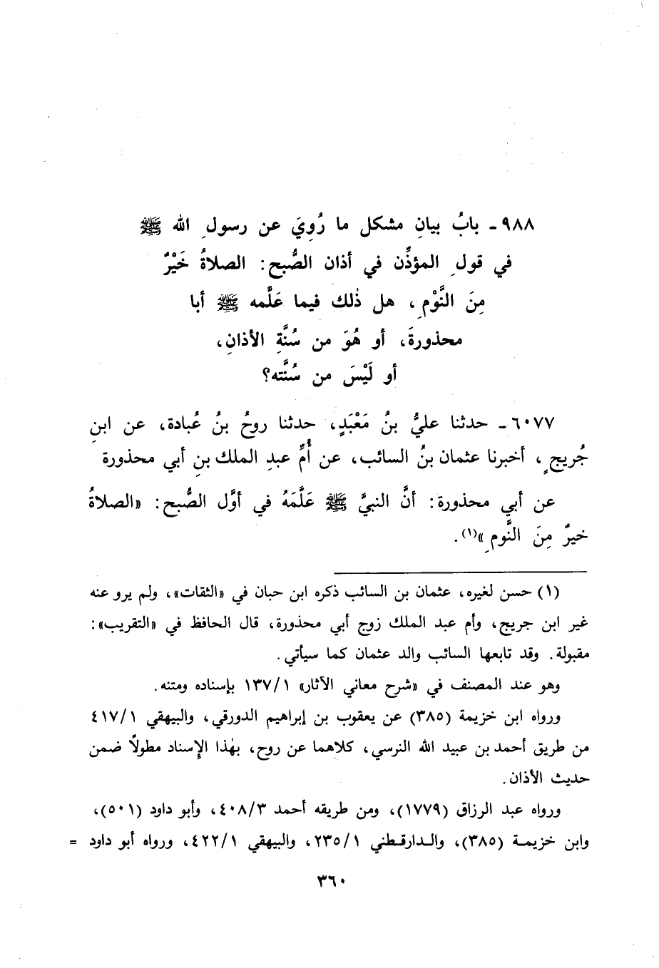 6077 - حَدَّثَنَا عَلِيُّ بْنُ مَعْبَدٍ، حَدَّثَنَا رَوْحُ بْنُ عُبَادَةَ، عَنِ ابْنِ جُرَيْجٍ، أَخْبَرَنَا عُثْمَانُ بْنُ السَّائِبِ، عَنْ أُمِّ عَبْدِ الْمَلِكِ بْنِ أَبِي مَحْذُورَةَ عَنْ أَبِي مَحْذُورَةَ: أَنَّ النَّبِيَّ صَلَّى اللَّهُ عَلَيْهِ وَسَلَّمَ عَلَّمَهُ فِي أَوَّلِ الصُّبْحِ: " الصَّلَاةُ خَيْرٌ مِنَ النَّوْمِ "