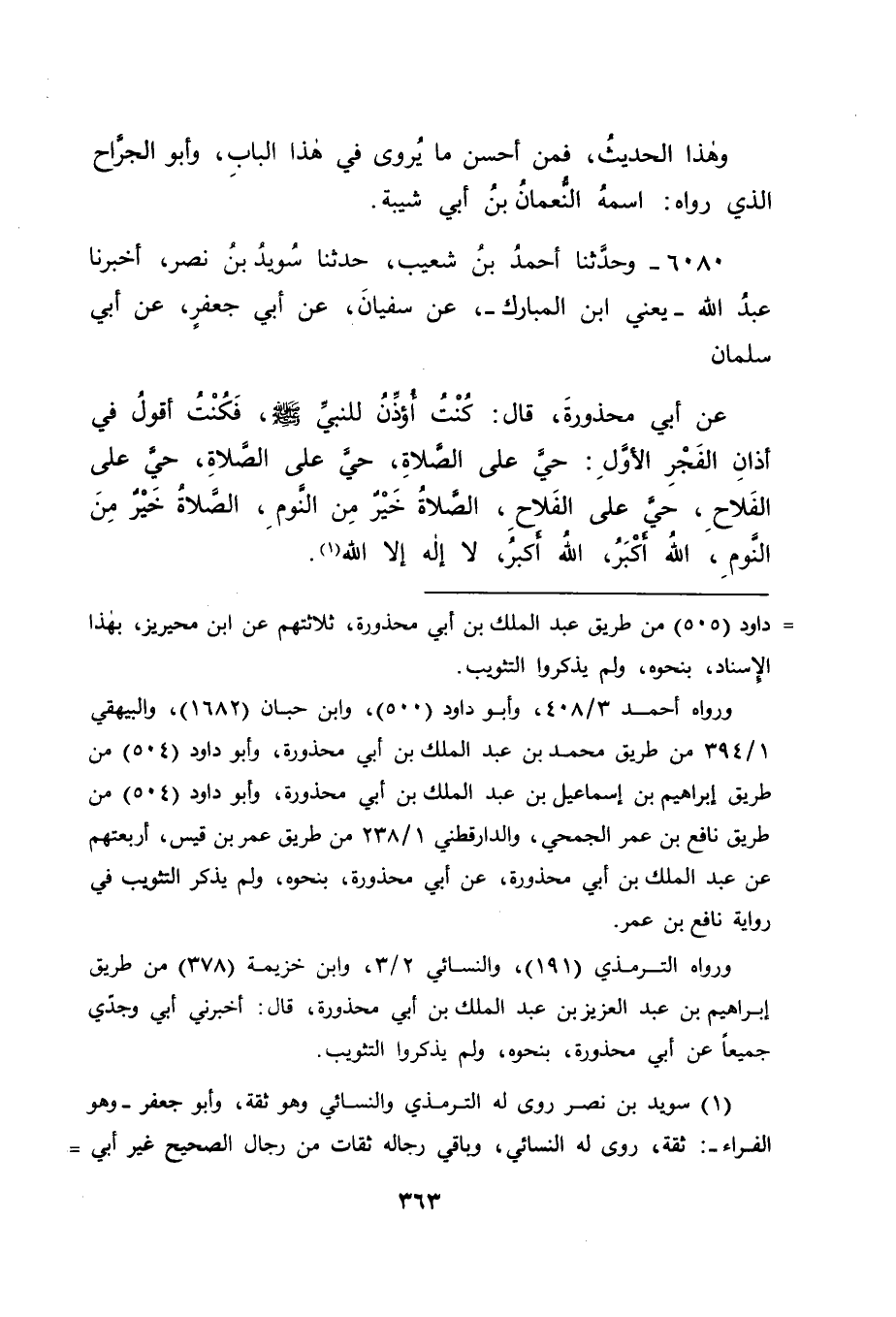 6081 - وَحَدَّثَنَا أَحْمَدُ، حَدَّثَنَا عَمْرُو بْنُ عَلِيٍّ، حَدَّثَنَا يَحْيَى، وَعَبْدُ الرَّحْمَنِ قَالَا: حَدَّثَنَا سُفْيَانُ، بِهَذَا الْإِسْنَادِ نَحْوَهُ قَالَ عَبْدُ الرَّحْمَنِ: وَلَيْسَ بِأَبِي جَعْفَرٍ الْفَرَّاءِ. فَفِيمَا ذَكَرْنَا عَنْ أَبِي مَحْذُورَةَ تَحْقِيقُ الصَّلَاةُ خَيْرٌ مِنَ النَّوْمِ فِي الْأَذَانِ لِلْقَوْمِ.