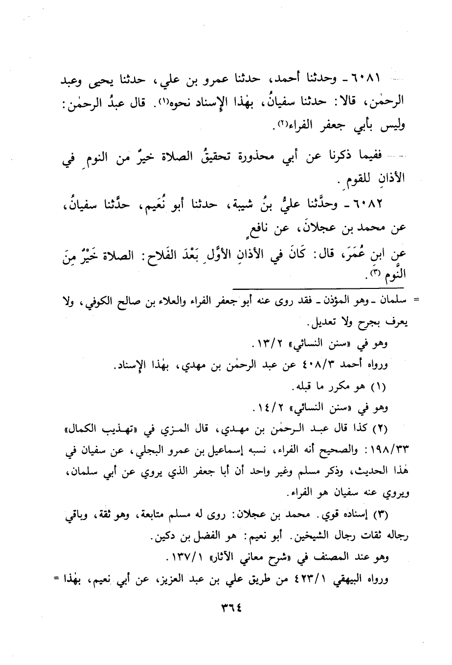6082 - وَحَدَّثَنَا عَلِيُّ بْنُ شَيْبَةَ، حَدَّثَنَا أَبُو نُعَيْمٍ، حَدَّثَنَا سُفْيَانُ، عَنْ مُحَمَّدِ بْنِ عَجْلَانَ، عَنْ نَافِعٍ، عَنِ ابْنِ عُمَرَ قَالَ: " كَانَ فِي الْأَذَانِ الْأَوَّلِ بَعْدَ الْفَلَاحِ: الصَّلَاةُ خَيْرٌ مِنَ النَّوْمِ "