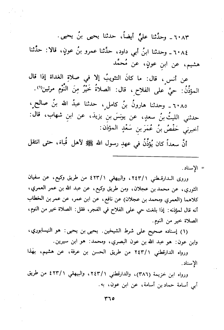 6084 - وَحَدَّثَنَا ابْنُ أَبِي دَاوُدَ، حَدَّثَنَا عَمْرُو بْنُ عَوْنٍ، قَالَا: حَدَّثَنَا هُشَيْمٌ، عَنِ ابْنِ عَوْنٍ، عَنْ مُحَمَّدٍ، عَنْ أَنَسٍ قَالَ: " مَا كَانَ التَّثْوِيبُ إِلَّا فِي صَلَاةِ الْغَدَاةِ، إِذَا قَالَ الْمُؤَذِّنُ: حَيَّ عَلَى الْفَلَاحِ قَالَ: الصَّلَاةُ خَيْرٌ مِنَ النَّوْمِ مَرَّتَيْنِ "