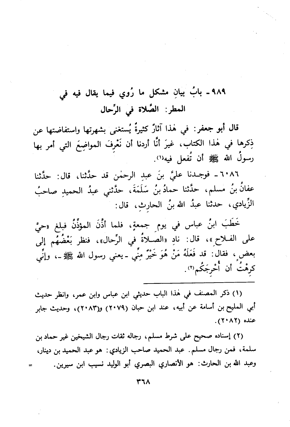 6086 - فَوَجَدْنَا عَلِيَّ بْنَ عَبْدِ الرَّحْمَنِ قَدْ حَدَّثَنَا قَالَ: حَدَّثَنَا عَفَّانُ بْنُ مُسْلِمٍ، حَدَّثَنَا حَمَّادُ بْنُ سَلَمَةَ، حَدَّثَنِي عَبْدُ الْحَمِيدِ صَاحِبُ الزِّيَادِيِّ، حَدَّثَنَا عَبْدُ اللهِ بْنُ الْحَارِثِ، قَالَ: خَطَبَ ابْنُ عَبَّاسٍ فِي يَوْمِ جُمُعَةٍ، فَلَمَّا أَذَّنَ الْمُؤَذِّنُ، فَبَلَغَ: " حَيَّ عَلَى الْفَلَاحِ "، قَالَ: نَادِ: الصَّلَاةُ فِي الرِّحَالِ "، فَنَظَرَ بَعْضُهُمْ إِلَى بَعْضٍ، فَقَالَ: قَدْ فَعَلَهُ مَنْ هُوَ خَيْرٌ مِنِّي - يَعْنِي رَسُولَ اللهِ صَلَّى اللَّهُ عَلَيْهِ وَسَلَّمَ -، وَإِنِّي كَرِهْتُ أَنْ أُحْرِجَكُمْ " -[369]- وَعَبْدُ الْحَمِيدِ هَذَا رَجُلٌ جَلِيلٌ، وَقَدْ رَوَى عَنْهُ شُعْبَةُ، وَحَمَّادُ بْنُ زَيْدٍ، فَهَذِهِ سُنَّةٌ قَدْ وَقَفْنَا بِهَذَا الْحَدِيثِ، أَنَّهُ مِمَّا يَجِبُ إِدْخَالُهَا فِي الْآثَارِ عِنْدَ الْحَاجَةِ إِلَيْهَا. وَقَدْ رُوِيَ عَنِ ابْنِ عُمَرَ مَا دَلَّ عَلَى ذَلِكَ أَيْضًا