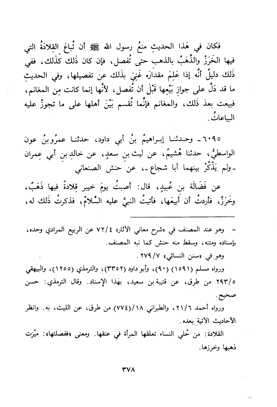 6095 - وَحَدَّثَنَا إِبْرَاهِيمُ بْنُ أَبِي دَاوُدَ، حَدَّثَنَا عَمْرُو بْنُ عَوْنٍ الْوَاسِطِيُّ، حَدَّثَنَا هُشَيْمٌ، عَنْ لَيْثِ بْنِ سَعْدٍ، عَنْ خَالِدِ بْنِ أَبِي عِمْرَانَ، وَلَمْ يَذْكُرْ بَيْنَهُمَا أَبَا شُجَاعٍ، عَنْ حَنَشٍ الصَّنْعَانِيِّ، عَنْ فَضَالَةَ بْنِ عُبَيْدٍ قَالَ: أَصَبْتُ يَوْمَ خَيْبَرَ قِلَادَةً فِيهَا ذَهَبٌ وَخَرَزٌ، فَأَرَدْتُ أَنْ أَبِيعَهَا، فَأَتَيْتُ النَّبِيَّ عَلَيْهِ السَّلَامُ، فَذَكَرْتُ ذَلِكَ لَهُ، -[379]- فَقَالَ: " افْصِلْ بَعْضَهَا مِنْ بَعْضٍ، ثُمَّ بِعْهَا كَيْفَ شِئْتَ " فَكَانَ حَدِيثُ اللَّيْثِ الَّذِي بَدَأْنَا بِذِكْرِهِ هُوَ الصَّحِيحُ فِي هَذَا الْبَابِ مِنْ حَدِيثِهِ لِأَنَّهُ كَذَلِكَ هُوَ عِنْدَ أَهْلِ بَلَدِهِ عَنْهُ.