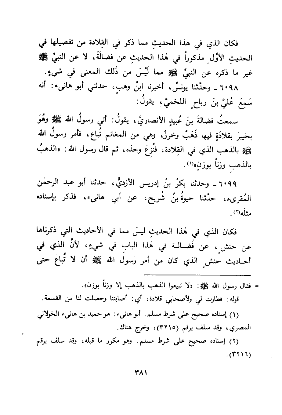 6098 - وَحَدَّثَنَا يُونُسُ، أَخْبَرَنَا ابْنُ وَهْبٍ، حَدَّثَنِي أَبُو هَانِئٍ: أَنَّهُ سَمِعَ عَلِيَّ بْنَ رَبَاحٍ اللَّخْمِيِّ يَقُولُ: سَمِعْتُ فَضَالَةَ بْنَ عُبَيْدٍ الْأَنْصَارِيَّ يَقُولُ: أُتِيَ رَسُولُ اللهِ صَلَّى اللَّهُ عَلَيْهِ وَسَلَّمَ وَهُوَ بِخَيْبَرَ بِقِلَادَةٍ فِيهَا ذَهَبٌ وَخَرَزٌ، وَهِيَ مِنَ الْمَغَانِمِ تُبَاعُ، فَأَمَرَ رَسُولُ اللهِ صَلَّى اللَّهُ عَلَيْهِ وَسَلَّمَ بِالذَّهَبِ الَّذِي فِي الْقِلَادَةِ فَنُزِعَ وَحْدَهُ، ثُمَّ قَالَ رَسُولُ اللهِ: " الذَّهَبُ بِالذَّهَبِ وَزْنًا بِوَزْنٍ "