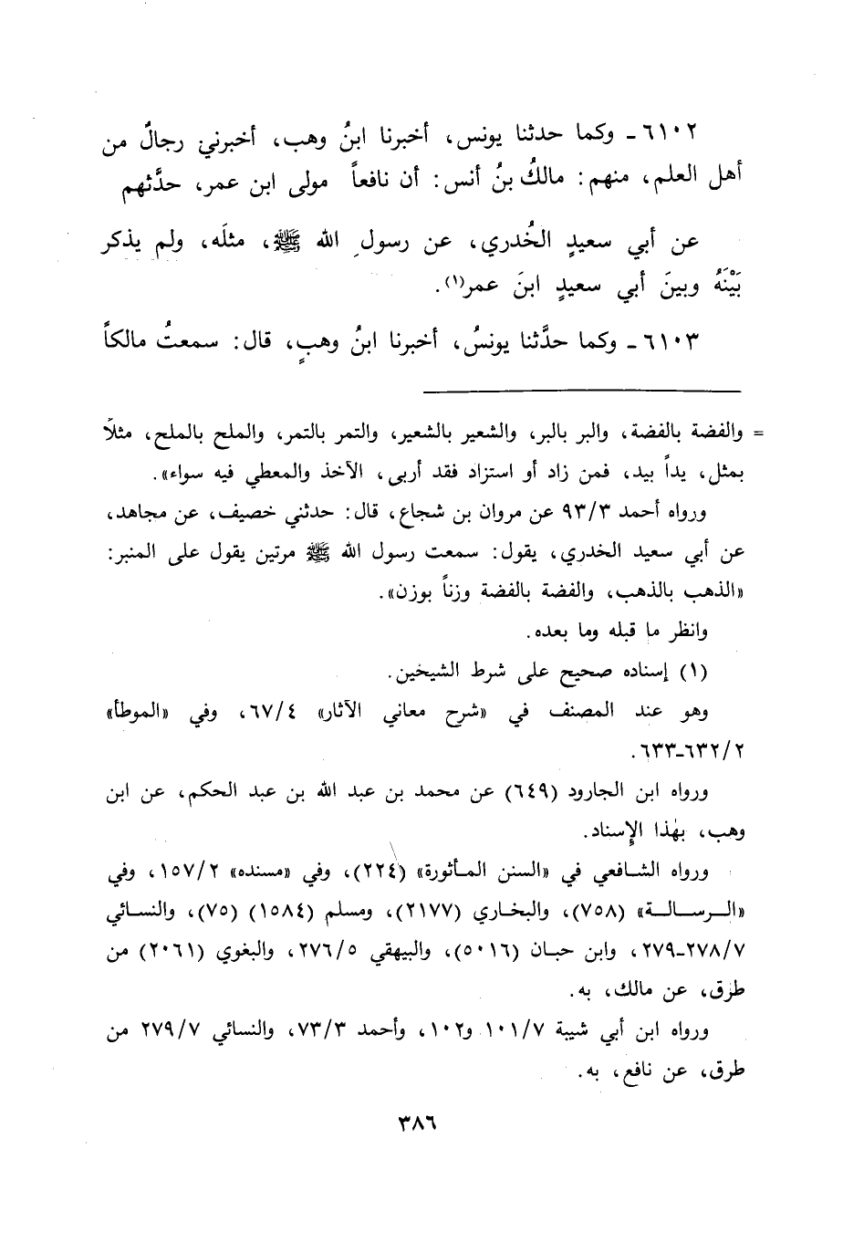6103 - وَكَمَا حَدَّثَنَا يُونُسُ، أَخْبَرَنَا ابْنُ وَهْبٍ قَالَ: سَمِعْتُ مَالِكًا -[387]- يَقُولُ: حَدَّثَنِي مُوسَى بْنُ أَبِي تَمِيمٍ، عَنْ سَعِيدِ بْنِ يَسَارٍ، عَنْ أَبِي هُرَيْرَةَ: أَنَّ رَسُولَ اللهِ صَلَّى اللَّهُ عَلَيْهِ وَسَلَّمَ، قَالَ: " الدِّينَارُ بِالدِّينَارِ، وَالدِّرْهَمُ بِالدِّرْهَمِ، لَا فَضْلَ بَيْنَهُمَا "
