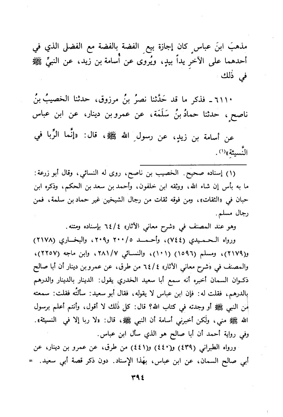 6110 - فَذَكَرَ مَا قَدْ حَدَّثَنَا نَصْرُ بْنُ مَرْزُوقٍ، حَدَّثَنَا الْخَصِيبُ بْنُ نَاصِحٍ، حَدَّثَنَا حَمَّادُ بْنُ سَلَمَةَ، عَنْ عَمْرِو بْنِ دِينَارٍ، عَنِ ابْنِ عَبَّاسٍ، عَنْ أُسَامَةَ بْنِ زَيْدٍ، عَنْ رَسُولِ اللهِ صَلَّى اللَّهُ عَلَيْهِ وَسَلَّمَ قَالَ: " إِنَّمَا الرِّبَا فِي النَّسِيئَةِ " -[395]-