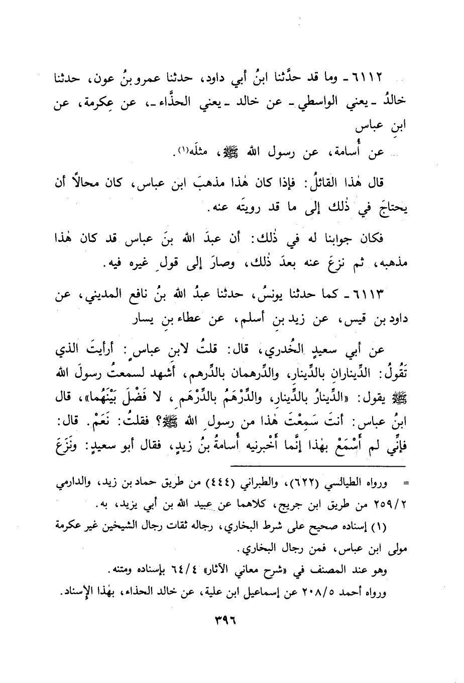 6113 - كَمَا حَدَّثَنَا يُونُسُ، حَدَّثَنَا عَبْدُ اللهِ بْنُ نَافِعٍ الْمَدِينِيُّ، عَنْ دَاوُدَ بْنِ قَيْسٍ، عَنْ زَيْدِ بْنِ أَسْلَمَ، عَنْ عَطَاءِ بْنِ يَسَارٍ، عَنْ أَبِي سَعِيدٍ الْخُدْرِيِّ قَالَ: قُلْتُ لِابْنِ عَبَّاسٍ: أَرَأَيْتَ الَّذِيَ تَقُولُ: الدِّينَارَانِ بِالدِّينَارِ، وَالدِّرْهَمَانِ بِالدِّرْهَمِ، أَشْهَدُ لَسَمِعْتُ رَسُولَ اللهِ صَلَّى اللَّهُ عَلَيْهِ وَسَلَّمَ يَقُولُ: " الدِّينَارُ بِالدِّينَارِ، وَالدِّرْهَمُ بِالدِّرْهَمِ، لَا فَضْلَ بَيْنَهُمَا " قَالَ ابْنُ عَبَّاسٍ: أَنْتَ سَمِعْتَ هَذَا مِنْ رَسُولِ اللهِ صَلَّى اللَّهُ عَلَيْهِ وَسَلَّمَ؟ فَقُلْتُ: نَعَمْ، قَالَ: فَإِنِّي لَمْ أَسْمَعْ بِهَذَا، إِنَّمَا أَخْبَرَنِيهِ أُسَامَةُ بْنُ زَيْدٍ، فَقَالَ أَبُو سَعِيدٍ: وَنَزَعَ -[397]- عَنْهَا ابْنُ عَبَّاسٍ " -[398]- فَقَالَ قَائِلٌ: وَمِنْ أَيْنَ نَزَعَ ابْنُ عَبَّاسٍ، عَمَّا كَانَ عَلَيْهِ قَبْلَ ذَلِكَ، وَقَدْ كَانَ أَخَذَهُ عَنْ أُسَامَةَ بْنِ زَيْدٍ، وَمَوْضِعُ أُسَامَةَ مِنَ الْإِسْلَامِ مَوْضِعُهُ إِلَى مَا حَدَّثَهُ بِهِ غَيْرُهُ مِمَّا يَجُوزُ أَنْ يَكُونَ حَدَّثَهُ بِهِ أُسَامَةُ نَاسِخًا لَهُ؟ . فَكَانَ جَوَابُنَا لَهُ فِي ذَلِكَ: أَنَّ الرِّبَا الَّذِي حَرَّمَهُ الْقُرْآنُ، وَجَاءَ فِيهِ الْوَعِيدُ عَلَيْهِ، هُوَ الرِّبَا فِي النَّسِيئَةِ، وَهُوَ مَا كَانُوا يَتَبَايَعُونَ مِنَ الْآجَالِ فِي الْأَمْوَالِ بِالْأَمْوَالِ، فَكَانَ ذَلِكَ مِمَّا حَرَّمَهُ الْقُرْآنُ، وَتَوَعَّدَ اللهُ تَعَالَى عَلَيْهِ بِمَا تَوَعَّدَ، فَكَانَ رِبًا النَّسِيئَةِ هُوَ التَّفَاضُلِ فِي الْأَشْيَاءِ الْمَكِيلَاتِ، وَالْمَوْزُونَاتِ، فَوَقَفَ ابْنُ عَبَّاسٍ عَلَى أَنَّ الَّذِيَ حَدَّثَهُ أَبُو سَعِيدٍ عَنْ رَسُولِ اللهِ صَلَّى اللَّهُ عَلَيْهِ وَسَلَّمَ كَانَ فِي رِبًا غَيْرِ رِبًا النَّسِيئَةِ، فَصَارَ إِلَيْهِ، وَتَرَكَ مَا كَانَ عَلَيْهِ قَبْلَ ذَلِكَ، إِذْ كَانَ فِي رِبًا سِوَى ذَلِكَ.
