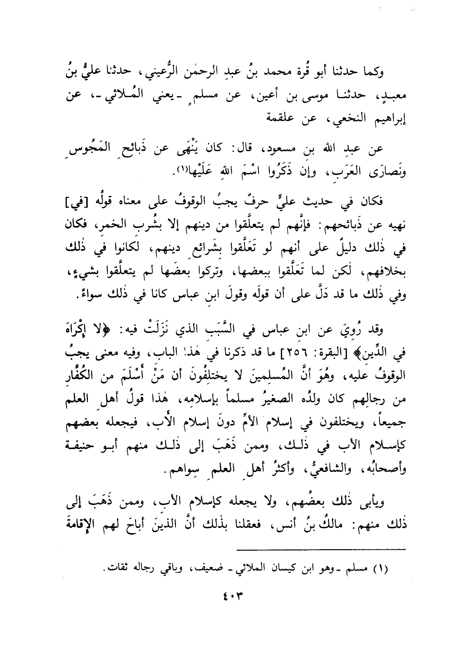 وَكَمَا حَدَّثَنَا أَبُو قُرَّةَ مُحَمَّدُ بْنُ عَبْدِ الرَّحْمَنِ الرُّعَيْنِيُّ، حَدَّثَنَا عَلِيُّ بْنُ مَعْبَدٍ، حَدَّثَنَا مُوسَى بْنُ أَعْيَنَ، عَنْ مُسْلِمٍ يَعْنِي الْمُلَائِيَّ، عَنْ إِبْرَاهِيمَ النَّخَعِيِّ، عَنْ عَلْقَمَةَ، عَنْ عَبْدِ اللهِ بْنِ مَسْعُودٍ قَالَ: كَانَ يَنْهَى عَنْ ذَبَائِحِ الْمَجُوسِ وَنَصَارَى الْعَرَبِ، وَإِنْ ذَكَرُوا اسْمَ اللهِ عَلَيْهَا " فَكَانَ فِي حَدِيثِ عَلِيٍّ حَرْفٌ يَجِبُ الْوُقُوفُ عَلَى مَعْنَاهُ قَوْلُهُ فِي نَهْيِهِ عَنْ ذَبَائِحِهِمْ، فَإِنَّهُمْ لَمْ يَتَعَلَّقُوا مِنْ دِينِهِمْ، إِلَّا بِشُرْبِ الْخَمْرِ، فَكَانَ فِي ذَلِكَ دَلِيلٌ عَلَى أَنَّهُمْ لَوْ تَعَلَّقُوا بِشَرَائِعِ دِينِهِمْ، لَكَانُوا فِي ذَلِكَ بِخِلَافِهِمْ، لَكِنْ لَمَّا تَعَلَّقُوا بِبَعْضِهَا، وَتَرَكُوا بَعْضَهَا لَمْ يَتَعَلَّقُوا بشَيْءٍ، وَفِي ذَلِكَ مَا قَدْ دَلَّ عَلَى أَنَّ قَوْلَهُ، وَقَوْلَ ابْنِ عَبَّاسٍ كَانَا فِي ذَلِكَ سَوَاءٌ. وَقَدْ رُوِيَ عَنِ ابْنِ عَبَّاسٍ فِي السَّبَبِ الَّذِي نَزَلَتْ فِيهِ: {لَا إِكْرَاهَ فِي الدِّينِ} [البقرة: 256] ، مَا قَدْ ذَكَرْنَا فِي هَذَا الْبَابِ، وَفِيهِ مَعْنًى يَجِبُ الْوُقُوفُ عَلَيْهِ، وَهُوَ أَنَّ الْمُسْلِمِينَ لَا يَخْتَلِفُونَ أَنَّ مَنْ أَسْلَمَ مِنَ الْكُفَّارِ مِنْ رِجَالِهِمْ، كَانَ وَلَدُهُ الصَّغِيرُ مُسْلِمًا بِإِسْلَامِهِ، هَذَا قَوْلُ أَهْلِ الْعِلْمِ جَمِيعًا، وَيَخْتَلِفُونَ فِي إِسْلَامِ الْأُمِّ دُونَ إِسْلَامِ الْأَبِ، فَيَجْعَلُهُ بَعْضُهُمْ كَإِسْلَامِ الْأَبِ فِي ذَلِكَ، وَمِمَّنْ ذَهَبَ إِلَى ذَلِكَ مِنْهُمْ أَبُو حَنِيفَةَ، وَأَصْحَابُهُ، وَالشَّافِعِيُّ، وَأَكْثَرُ أَهْلِ الْعِلْمِ سِوَاهُمْ. وَيَأْبَى ذَلِكَ بَعْضُهُمْ، وَلَا يَجْعَلَهُ كَإِسْلَامِ الْأَبِ، وَمِمَّنْ ذَهَبَ إِلَى ذَلِكَ مِنْهُمْ: مَالِكُ بْنُ أَنَسٍ، فَعَقِلْنَا بِذَلِكَ أَنَّ الَّذِينَ أَبَاحَ لَهُمُ الْإِقَامَةَ -[404]- عَلَى مَا هُمْ عَلَيْهِ مِنَ الْيَهُودِيَّةِ مِنْ أَبْنَاءِ الْأَنْصَارِ، وَإِخْوَانِهِمْ كَانُوا كُفَّارًا حِينَئِذٍ لَيْسُوا مِمَّنْ حُكْمُهُمْ حُكْمُ آبَائِهِمْ، فَلِذَلِكَ خَلَّى بَيْنَهُمْ النَّبِيُّ صَلَّى اللَّهُ عَلَيْهِ وَسَلَّمَ، وَبَيْنَ مَا هُمْ عَلَيْهِ مِنَ الْيَهُودِيَّةِ مِنْ أَبْنَاءِ الْأَنْصَارِ. ثُمَّ وَجَدْنَا أَهْلَ الْعِلْمِ يَخْتَلِفُونَ فِيمَنْ تَهَوَّدَ مِنَ الْعَرَبِ فَيَقُولُونَ: هُوَ دَاخِلٌ فِي ذَلِكَ الدِّينِ فِي أَيِّ زَمَانٍ كَانَ ذَلِكَ مِنْهُ فِيهِ، وَمِمَّنْ ذَهَبَ إِلَى ذَلِكَ مِنْهُمْ: أَبُو حَنِيفَةَ وَأَصْحَابُهُ، وَيَقُولُ بَعْضُهُمْ: إِنْ كَانَ ذَلِكَ مِنْهُمْ قَبْلَ نُزُولِ الْفُرْقَانِ خُلِّيَ بَيْنَهُمْ، وَبَيْنَ ذَلِكَ، وَإِنْ كَانَ بَعْدَ نُزُولِ الْفُرْقَانِ، مُنِعُوا مِنْ ذَلِكَ، وَمِمَّنْ ذَهَبَ إِلَى ذَلِكَ مِنْهُمُ: الشَّافِعِيُّ. وَفِي حَدِيثِ ابْنِ عَبَّاسٍ: أَنَّ النَّبِيَّ صَلَّى اللَّهُ عَلَيْهِ وَسَلَّمَ لَمْ يَكْشِفْ عَمَّنْ خَلَّى بَيْنَهُمْ، وَبَيْنَ مَا هُمْ عَلَيْهِ مِنَ الْيَهُودِيَّةِ مِنْ أَبْنَاءِ الْأَنْصَارِ وَإِخْوَانِهِمْ عَنْ دُخُولِهِمْ فِي الْيَهُودِيَّةِ مَتَى كَانَ؟ هَلْ كَانَ بَعْدَ نُزُولِ الْفُرْقَانِ، أَوْ قَبْلَهُ، لِأَنَّ الْفُرْقَانَ قَدْ أُنْزِلَ عَلَيْهِ فِيهِ مِمَّا أُنْزِلَ عَلَيْهِ مِنْهُ بِمَكَّةَ، وَقَدْ أَقَامَ بِهَا بَعْدَ ذَلِكَ عَشْرَ سِنِينَ، وَيَقُولُ بَعْضُهُمْ أَكْثَرَ مِنْ ذَلِكَ، وَأَقَامَ بِالْمَدِينَةِ بَعْدَ أَنْ قَدِمَهَا مُهَاجِرًا إِلَيْهَا قَبْلَ إِجْلَائِهِ بَنِي النَّضِيرَ سَبْعَ سِنِينَ، فَكَانَ فِي تَرْكِ السُّؤَالِ عَمَّنْ تَهَوَّدَ بِهَا مَا قَدْ دَلَّ أَنَّ