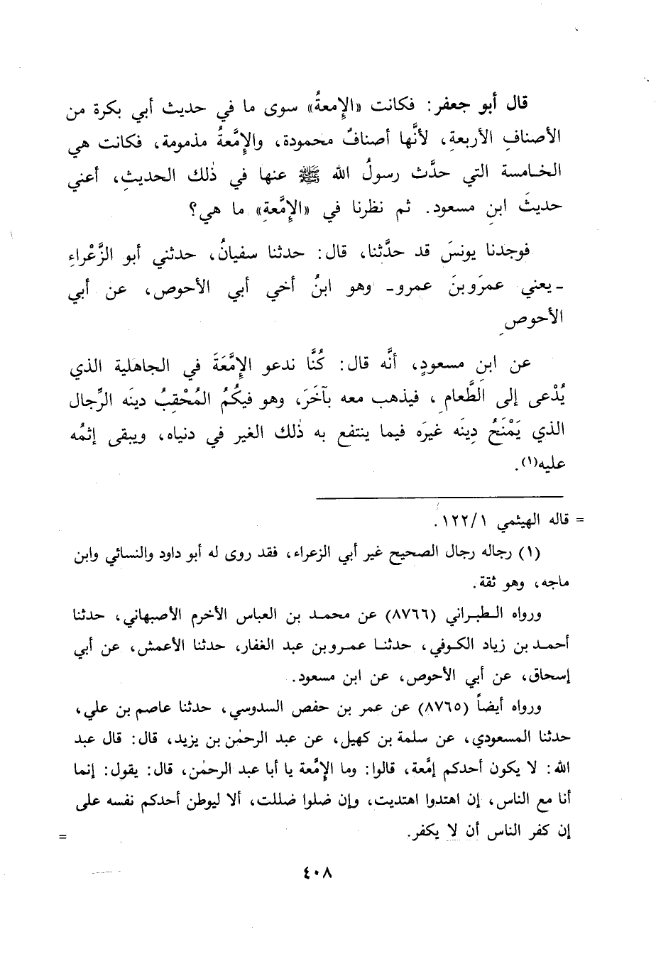 فَوَجَدْنَا يُونُسَ قَدْ حَدَّثَنَا، قَالَ: حَدَّثَنَا سُفْيَانُ، حَدَّثَنِي أَبُو الزَّعْرَاءِ يَعْنِي عَمْرَو بْنَ عَمْرٍو وَهُوَ ابْنُ أَخِي أَبِي الْأَحْوَصِ، عَنْ أَبِي الْأَحْوَصِ، عَنِ ابْنِ مَسْعُودٍ أَنَّهُ قَالَ: " كُنَّا نَدْعُو الْإِمَّعَةَ فِي الْجَاهِلِيَّةِ الَّذِي يُدْعَى إِلَى الطَّعَامِ، فَيَذْهَبُ مَعَهُ بِآخَرَ، وَهُوَ فِيكُمُ الْمُحْقِبُ دِينَهُ الرِّجَالَ الَّذِي يَمْنَحُ دِينَهُ غَيْرَهُ، فِيمَا يَنْتَفِعُ بِهِ ذَلِكَ الْغِيَرُ فِي دُنْيَاهُ، وَيَبْقَى إِثْمُهُ عَلَيْهِ " -[409]- وَلَمْ نَجِدْ فِي تَأْوِيلِ الْإِمَّعَةِ شَيْئًا أَعْلَى مِمَّا رُوِّينَاهُ عَنِ ابْنِ مَسْعُودٍ، وَقَدْ ذَكَرَ لَنَا ذَلِكَ عَلِيُّ بْنُ عَبْدِ الْعَزِيزِ، عَنْ أَبِي عُبَيْدٍ فِي حَدِيثِ عَبْدِ اللهِ، قَالَ: الْإِمَّعَةُ الَّذِي يَقُولُ: أَنَا مَعَ النَّاسِ، يَعْنِي يُتَابِعُ كُلَّ أَحَدٍ عَلَى رَأْيِهِ، وَلَا يَثْبُتُ عَلَى شَيْءٍ، فَكَانَ هَذَا مَا وَصَفْنَا مِنْهُ لِلَّذِي يَكُونُ كَذَلِكَ، لَا وَصْفَ فِيهِ لِلَّذِي يَجُرُّهُ إِلَى ذَلِكَ، وَالْقَوْمُ بِلُغَتِهِمْ، وَاللهُ الْمُوَفِّقُ.