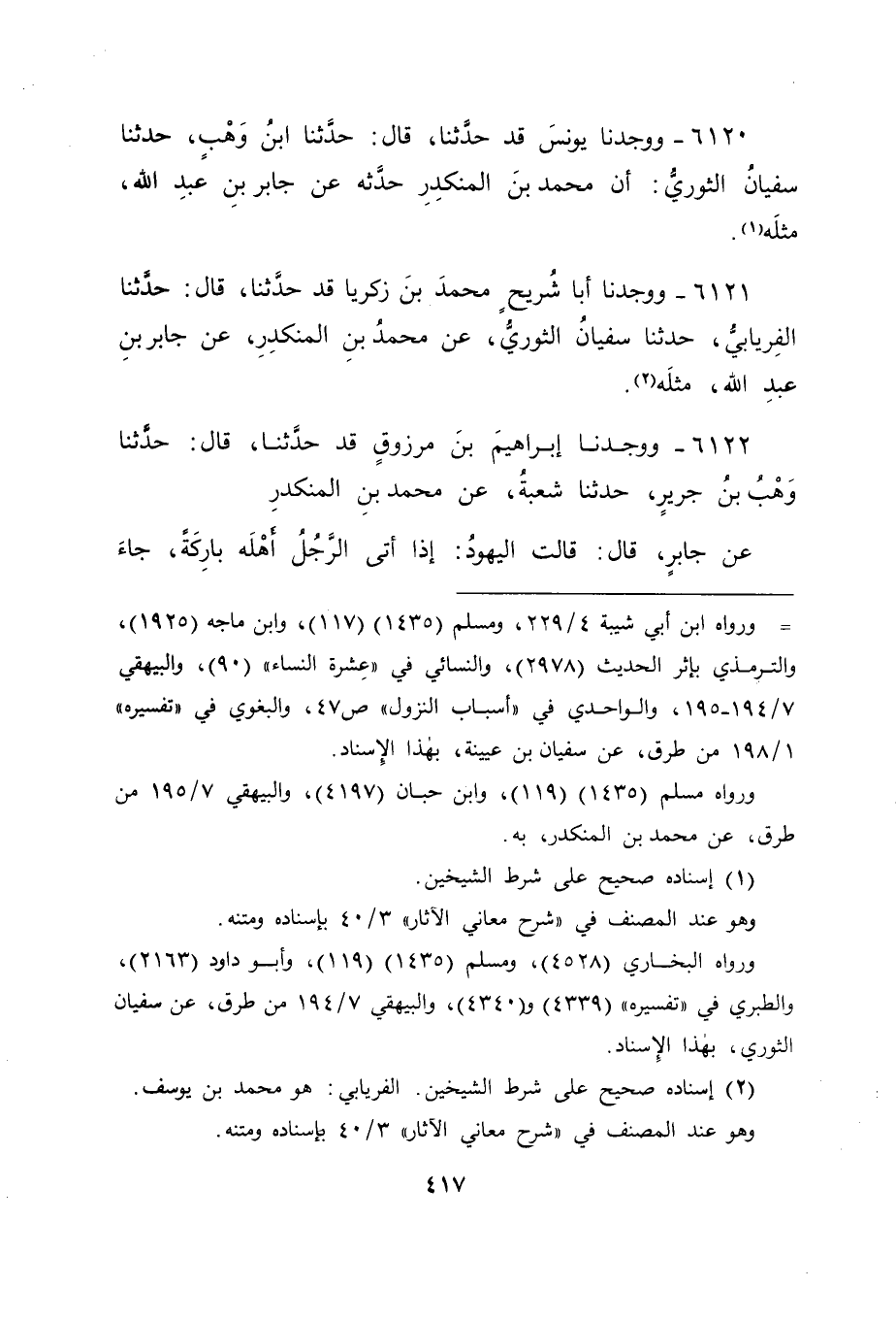 6122 - وَوَجَدْنَا إِبْرَاهِيمَ بْنَ مَرْزُوقٍ قَدْ حَدَّثَنَا قَالَ حَدَّثَنَا وَهْبُ بْنُ جَرِيرٍ، حَدَّثَنَا شُعْبَةُ، عَنْ مُحَمَّدِ بْنِ الْمُنْكَدِرِ، عَنْ جَابِرٍ قَالَ: قَالَتِ الْيَهُودُ: إِذَا أَتَى الرَّجُلُ أَهْلَهُ بَارِكَةً جَاءَ -[418]- وَلَدُهُ أَحْوَلَ، فَذُكِرَ ذَلِكَ لِلنَّبِيِّ صَلَّى اللَّهُ عَلَيْهِ وَسَلَّمَ، فَأَنْزَلَ اللهُ عَزَّ وَجَلَّ: {نِسَاؤُكُمْ حَرْثٌ لَكُمْ فَأْتُوا حَرْثَكُمْ أَنَّى شِئْتُمْ} [البقرة: 223] "