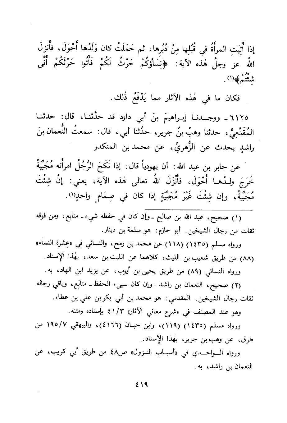 6125 - وَوَجَدْنَا إِبْرَاهِيمَ بْنَ أَبِي دَاوُدَ قَدْ حَدَّثَنَا قَالَ: حَدَّثَنَا الْمُقَدَّمِيُّ، حَدَّثَنَا وَهْبُ بْنُ جَرِيرٍ، حَدَّثَنَا أَبِي قَالَ: سَمِعْتُ النُّعْمَانَ بْنَ رَاشِدٍ، يُحَدِّثُ عَنِ الزُّهْرِيِّ، عَنْ مُحَمَّدِ بْنِ الْمُنْكَدِرِ، عَنْ جَابِرِ بْنِ عَبْدِ اللهِ: أَنْ يَهُودِيًّا، قَالَ: " إِذَا نَكَحَ الرَّجُلُ امْرَأَتَهُ مُجَبِّيَةً خَرَجَ وَلَدُهَا أَحْوَلَ، فَأَنْزَلَ اللهُ تَعَالَى هَذِهِ الْآيَةَ، يَعْنِي: إِنْ شِئْتَ مُجَبِّيَةً، وَإِنْ شِئْتَ غَيْرَ مُجَبِّيَةٍ، إِذَا كَانَ فِي صِمَامٍ وَاحِدٍ "