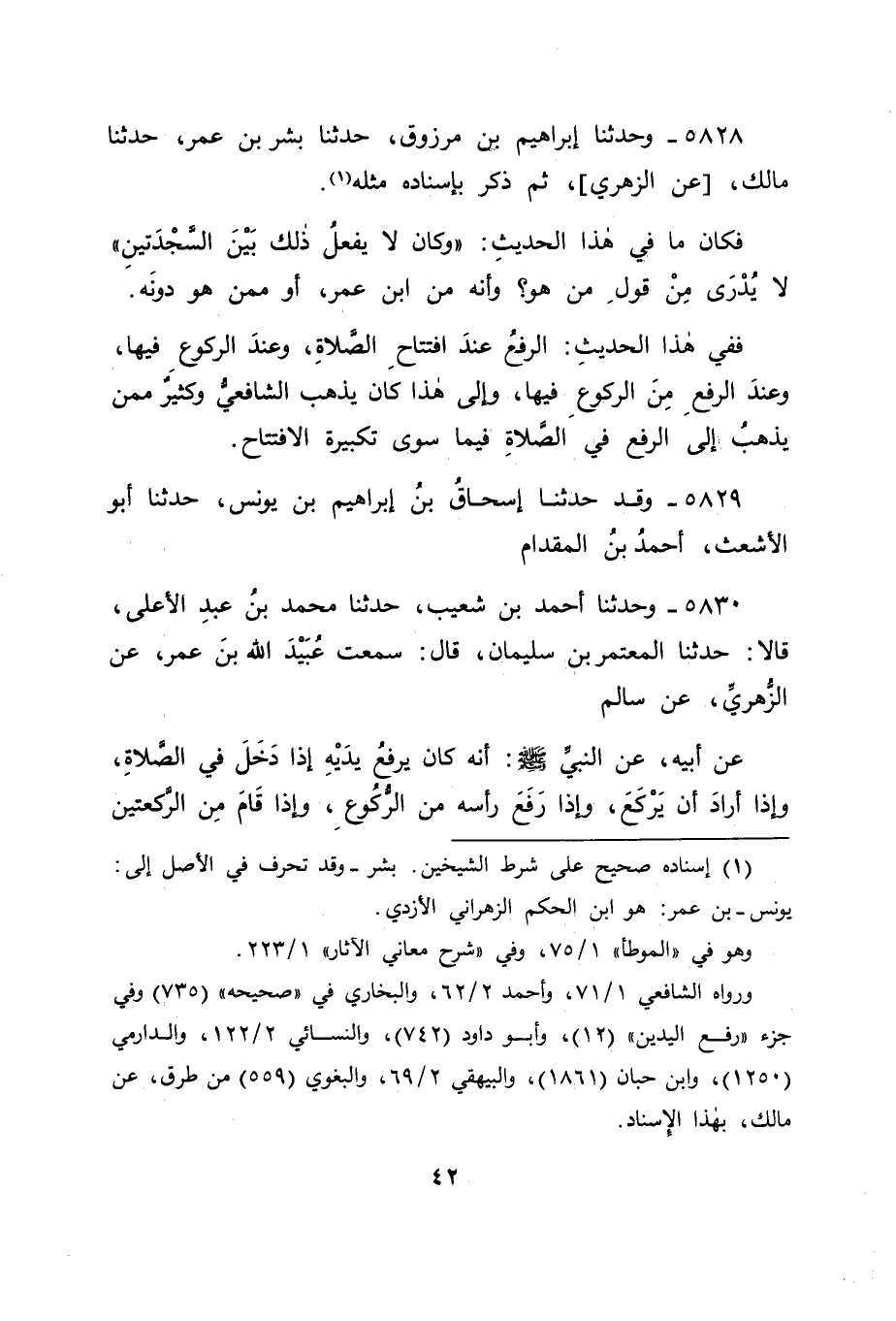 5830 - وَحَدَّثَنَا أَحْمَدُ بْنُ شُعَيْبٍ، حَدَّثَنَا مُحَمَّدُ بْنُ عَبْدِ الْأَعْلَى، قَالَا: حَدَّثَنَا الْمُعْتَمِرُ بْنُ سُلَيْمَانَ، قَالَ: سَمِعْتُ عُبَيْدَ اللهِ بْنَ عُمَرَ، عَنِ الزُّهْرِيِّ، عَنْ سَالِمٍ، عَنْ أَبِيهِ، عَنِ النَّبِيِّ صَلَّى اللَّهُ عَلَيْهِ وَسَلَّمَ: أَنَّهُ كَانَ يَرْفَعُ يَدَيْهِ إِذَا دَخَلَ فِي الصَّلَاةِ، وَإِذَا أَرَادَ أَنْ يَرْكَعَ، وَإِذَا رَفَعَ رَأْسَهُ مِنَ الرُّكُوعِ، وَإِذَا قَامَ مِنَ الرَّكْعَتَيْنِ -[43]- رَفَعَ يَدَيْهِ، وَذَلِكَ كُلُّهُ حِذَاءَ الْمَنْكِبَيْنِ " فَفِي هَذَا الْحَدِيثِ مِثْلُ مَا فِي الْحَدِيثِ الْأَوَّلِ وَزِيَادَةٌ عَلَيْهِ، وَهُوَ الرَّفْعُ مِنَ الْقُعُودِ إِلَى الْقِيَامِ فِيمَا بَعْدَ الرَّكْعَتَيْنِ، فَعَرَفْنَا بِمَا ذَكَرْنَا أَنَّهُ -[46]- لَا تُرْفَعُ الْأَيْدِي فِي الصَّلَاةِ إِلَّا فِي التَّكْبِيرَةِ الْأُولَى مِنْهَا، فَإِنِ احْتَجَّ أَحَدٌ بِمَا فِي حَدِيثَيْ مَالِكٍ وَسُفْيَانَ، عَنِ الزُّهْرِيِّ مِنَ اللَّذِينَ ذَكَرْنَا أَنَّهُ مَحْجُوجٌ بِمَا فِي حَدِيثِ عُبَيْدِ اللهِ هَذَا عَنِ الزُّهْرِيِّ مِنَ الرَّفْعِ بَعْدَ الْقِيَامِ مِنَ الْقُعُودِ، وَمَا يَلْزَمُ وَاحِدًا مِنْهُ وَمِنْ مُخَالِفِهِ فِي ذَلِكَ أَنْ لَا يَلْزَمَ الْآخَرَ مِنْهُ مِثْلُهُ، وَلَئِنْ كَانَ مَعْذُورًا بِخِلَافِهِ بِمَا رَوَاهُ عُبَيْدُ اللهِ، عَنِ الزُّهْرِيِّ فِيهِ إِنَّ خَصْمَهُ لَمَعْذُورٌ فِي تَرْكِهِ مَا رَوَاهُ مَالِكٌ وَسُفْيَانُ فِيهِ عَنِ الزُّهْرِيِّ، لِأَنَّ عُبَيْدَ اللهِ لَيْسَ بِدُونِ مَالِكٍ، وَلَا بِدُونِ سُفْيَانَ فِي هَذَا الْحَدِيثِ. مَعَ أَنَّا قَدْ وَجَدْنَا هَذَا الْحَدِيثَ مِنْ رِوَايَةِ نَافِعٍ مُوَافِقًا لِمَا رَوَاهُ عُبَيْدُ اللهِ فِي ذَلِكَ وَزَائِدًا عَلَيْهِ رَفْعًا فِيمَا سِوَى هَذِهِ الْمَوَاضِعِ الْمَذْكُورَاتِ فِيهِ