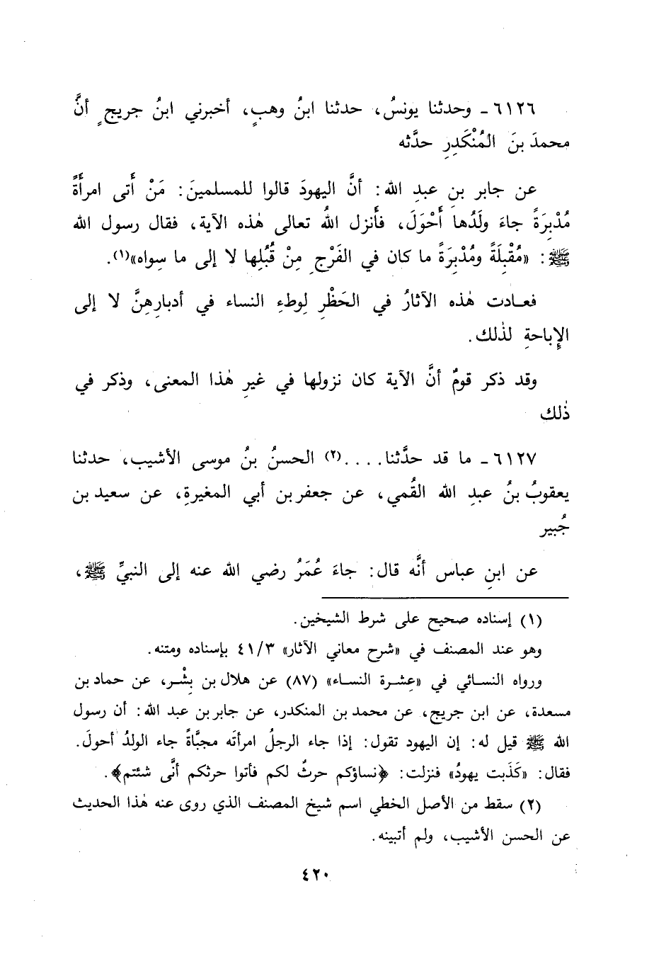 6127 - مَا قَدْ حَدَّثَنَا. . . . الْحَسَنُ بْنُ مُوسَى الْأَشْيَبُ، حَدَّثَنَا يَعْقُوبُ بْنُ عَبْدِ اللهِ الْقُمِّيُّ، عَنْ جَعْفَرِ بْنِ أَبِي الْمُغِيرَةِ، عَنْ سَعِيدِ بْنِ جُبَيْرٍ، عَنِ ابْنِ عَبَّاسٍ أَنَّهُ قَالَ: جَاءَ عُمَرُ رَضِيَ اللهُ عَنْهُ إِلَى النَّبِيِّ صَلَّى اللَّهُ عَلَيْهِ وَسَلَّمَ -[421]- فَقَالَ: يَا رَسُولَ اللهِ، هَلَكْتُ قَالَ: " وَمَا أَهْلَكَكَ؟ " قَالَ: حَوَّلْتُ رَحْلِي الْبَارِحَةَ، فَلَمْ يَرُدَّ عَلَيْهِ شَيْئًا، فَأَوْحَى اللهُ إِلَى رَسُولِ اللهِ صَلَّى اللَّهُ عَلَيْهِ وَسَلَّمَ هَذِهِ الْآيَةَ: {نِسَاؤُكُمْ حَرْثٌ لَكُمْ} [البقرة: 223] " أَقْبِلْ وَأَدْبِرْ، وَاتَّقِ الدُّبُرَ وَالْحَيْضَةَ " فَكَانَ فِي هَذَا الْحَدِيثِ أَنَّ سَبَبَ نُزُولِ هَذِهِ الْآيَةِ غَيْرُ السَّبَبِ الَّذِي ذُكِرَ فِيمَا تَقَدَّمَ مِمَّا ذَكَرْنَاهُ، وَفِيمَا تَقَدَّمَ مِنَّا فِي هَذَا الْبَابِ، وَكَانَ فِيهِ الْمَنْعُ مِنْ وَطْءِ النِّسَاءِ فِي أَدْبَارِهِنَّ، كَالْمَنْعِ مِنْ وَطْئِهِنَّ فِي حَيْضِهِنَّ، فَكَانَ -[422]- فِي هَذَا الْحَدِيثِ، إِنَّمَا دَارَ عَلَى ابْنِ عَبَّاسٍ. فَنَظَرْنَا: هَلْ رُوِيَ عَنِ ابْنِ عَبَّاسٍ مَا يُخَالِفُهُ، أَمْ لَا؟