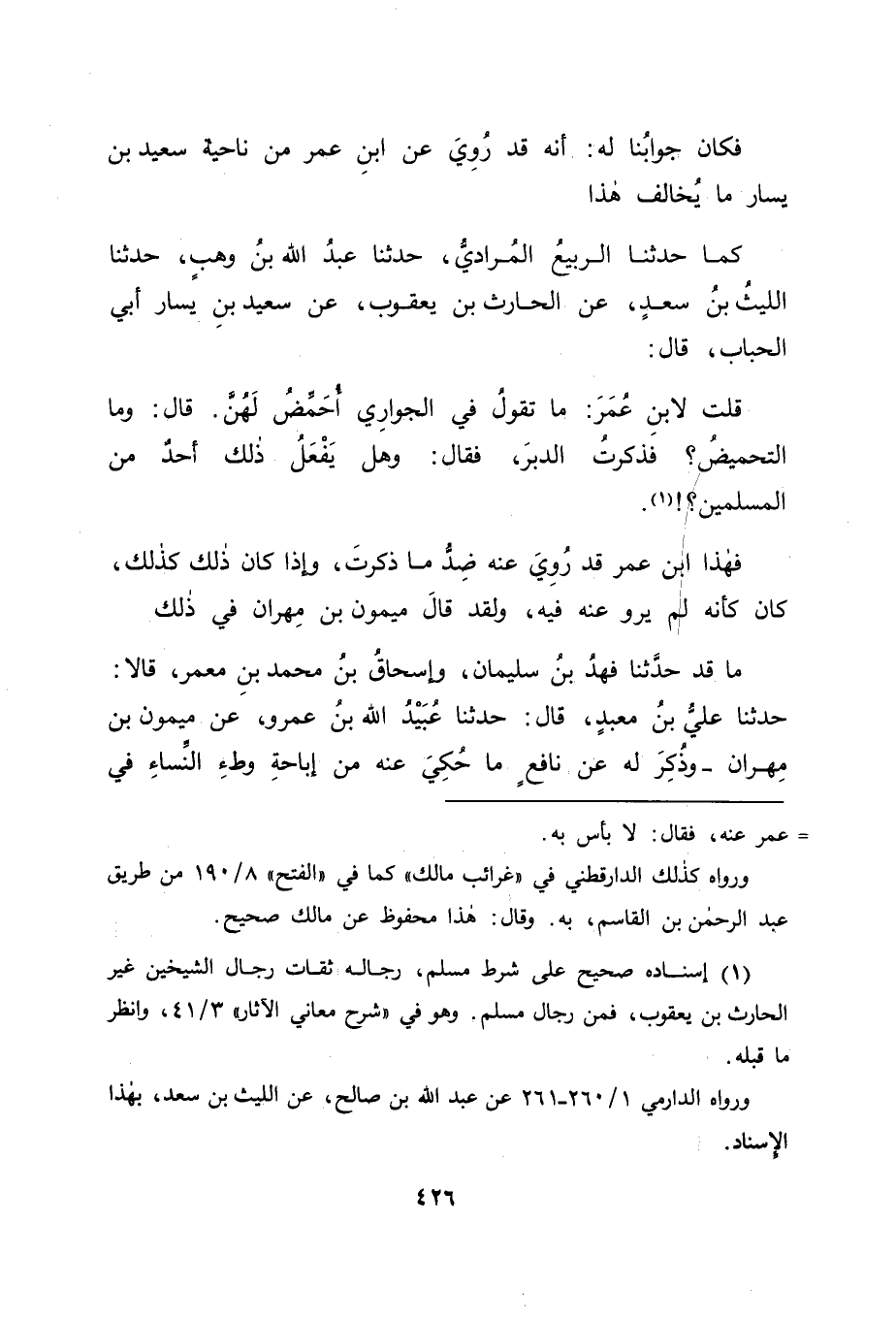 كَمَا حَدَّثَنَا الرَّبِيعُ الْمُرَادُيُّ، حَدَّثَنَا عَبْدُ اللهِ بْنُ وَهْبٍ، حَدَّثَنَا اللَّيْثُ بْنُ سَعْدٍ، عَنِ الْحَارِثِ بْنِ يَعْقُوبَ، عَنْ سَعِيدِ بْنِ يَسَارٍ أَبِي الْحُبَابِ قَالَ: قُلْتُ لِابْنِ عُمَرَ: مَا تَقُولُ فِي الْجَوَارِي أُحَمِّضُ لَهُنَّ، قَالَ: وَمَا التَّحْمِيضُ، فَذَكَرْتُ الدُّبُرَ، فَقَالَ: وَهَلْ يَفْعَلُ ذَلِكَ أَحَدٌ مِنَ الْمُسْلِمِينَ؟ " فَهَذَا ابْنُ عُمَرَ قَدْ رُوِيَ عَنْهُ ضِدُّ مَا ذَكَرْتَ، وَإِذَا كَانَ ذَلِكَ كَذَلِكَ، كَانَ كَأَنَّهُ لَمْ يُرْوَ عَنْهُ فِيهِ، وَلَقَدْ قَالَ مَيْمُونُ بْنُ مِهْرَانَ فِي ذَلِكَ مَا قَدْ حَدَّثَنَا فَهْدُ بْنُ سُلَيْمَانَ، وَإِسْحَاقُ بْنُ مُحَمَّدِ بْنِ مَعْمَرٍ قَالَا: حَدَّثَنَا عَلِيُّ بْنُ مَعْبَدٍ قَالَ: حَدَّثَنَا عُبَيْدُ اللهِ بْنُ عَمْرٍو، عَنْ مَيْمُونِ بْنِ مِهْرَانَ، وَذَكَرَ لَهُ عَنْ نَافِعٍ مَا حَكَى عَنْهُ مِنْ إِبَاحَةِ وَطْءِ النِّسَاءِ فِي -[427]- أَدْبَارِهِنَّ، فَقَالَ: إِنَّمَا قَالَ ذَلِكَ نَافِعٌ بَعْدَمَا كَبُرَ، وَذَهَبَ عَقْلُهُ. وَقَدْ رُوِيَ عَنْ سَالِمٍ نَفْيُ ذَلِكَ، عَنِ ابْنِ عُمَرَ.
