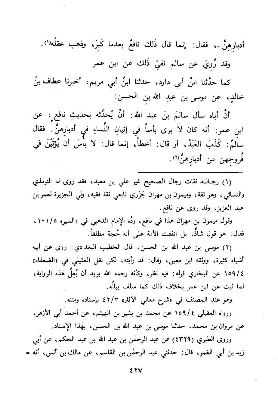 كَمَا حَدَّثَنَا ابْنُ أَبِي دَاوُدَ، حَدَّثَنَا ابْنُ أَبِي مَرْيَمَ، أَخْبَرَنَا عَطَّافُ بْنُ خَالِدٍ عَنْ مُوسَى بْنِ عَبْدِ اللهِ بْنِ الْحَسَنِ أَنَّ أَبَاهُ سَأَلَ سَالِمَ بْنَ عَبْدِ اللهِ أَنْ يُحَدِّثَهُ بِحَدِيثِ نَافِعٍ، عَنِ ابْنِ عُمَرَ: " أَنَّهُ كَانَ لَا يَرَى بَأْسًا فِي إِتْيَانِ النِّسَاءِ فِي أَدْبَارِهِنَّ، فَقَالَ سَالِمٌ: كَذَبَ الْعَبْدُ، أَوْ قَالَ: أَخْطَأَ، إِنَّمَا قَالَ: لَا بَأْسَ أَنْ يُؤْتَيْنَ فِي فُرُوجِهِنَّ مِنْ أَدْبَارِهِنَّ " -[428]- ثُمَّ نَظَرْنَا فِي سَبَبِ نُزُولِ هَذِهِ الْآيَةِ: هَلْ رُوِيَ فِيهِ عَنْ غَيْرِ مَنْ ذَكَرْنَا شَيْءٌ، أَمْ لَا؟