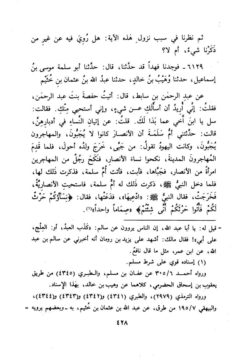 6129 - فَوَجَدْنَا فَهْدًا قَدْ حَدَّثَنَا قَالَ: حَدَّثَنَا أَبُو سَلَمَةَ مُوسَى بْنُ إِسْمَاعِيلَ، حَدَّثَنَا وُهَيْبُ بْنُ خَالِدٍ، حَدَّثَنَا عَبْدُ اللهِ بْنُ عُثْمَانَ بْنِ خُثَيْمٍ، عَنْ عَبْدِ الرَّحْمَنِ بْنِ سَابِطٍ قَالَ: أَتَيْتُ حَفْصَةَ بِنْتَ عَبْدِ الرَّحْمَنِ، فَقُلْتُ: إِنِّي أُرِيدُ أَنَّ أَسْأَلَكِ عَنْ شَيْءٍ، وَإِنِّي أَسْتَحْيِي مِنْكِ، فَقَالَتْ: سَلْ يَا ابْنَ أَخِي عَمَّا بَدَا لَكَ، قُلْتُ: عَنْ إِتْيَانِ النِّسَاءِ فِي أَدْبَارِهِنَّ، قَالَتْ: حَدَّثَتْنِي أُمُّ سَلَمَةَ، أَنَّ الْأَنْصَارَ كَانُوا لَا يُجَبُّونَ وَالْمُهَاجِرُونَ يُجَبُّونَ، وَكَانَتِ الْيَهُودُ تَقُولُ: مَنْ جَبَّى خَرَجَ وَلَدُهُ أَحْوَلَ، فَلَمَّا قَدِمَ الْمُهَاجِرُونَ الْمَدِينَةَ، نَكَحُوا نِسَاءَ الْأَنْصَارِ، فَنَكَحَ رَجُلٌ مِنَ الْمُهَاجِرِينَ امْرَأَةً مِنَ الْأَنْصَارِ، فَجَبَّاهَا، فَأَبَتْ، فَأَتَتْ أُمَّ سَلَمَةَ، فَذَكَرَتْ ذَلِكَ لَهَا، فَلَمَّا دَخَلَ النَّبِيُّ صَلَّى اللَّهُ عَلَيْهِ وَسَلَّمَ، ذَكَرَتْ ذَلِكَ لَهُ أُمُّ سَلَمَةَ، فَاسْتَحْيَتِ الْأَنْصَارِيَّةُ، فَخَرَجَتْ، فَقَالَ النَّبِيُّ صَلَّى اللَّهُ عَلَيْهِ وَسَلَّمَ: " ادْعِيهَا "، فَدَعَتْهَا، فَقَالَ: {نِسَاؤُكُمْ حَرْثٌ لَكُمْ فَأْتُوا حَرْثَكُمْ أَنَّى شِئْتُمْ} [البقرة: 223] " صِمَامًا وَاحِدًا " -[429]- فَكَانَ مَا فِي هَذَا الْحَدِيثِ رَدَّ مَا أُبِيحَ لَهُمْ بِهَذِهِ الْآيَةِ هُوَ مَا عَادَ إِلَى ذَلِكَ الصِّمَامِ، لَا إِلَى مَا سِوَاهُ. ثُمَّ نَظَرْنَا: هَلْ رُوِيَ فِي هَذَا الْبَابِ غَيْرُ هَذِهِ الْآثَارِ؟