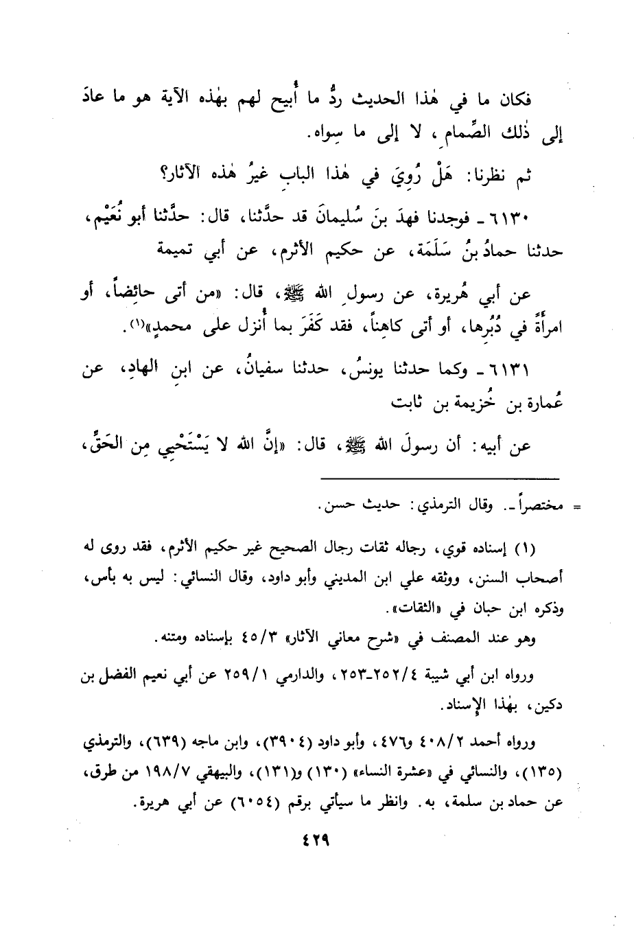 6130 - فَوَجَدْنَا فَهْدَ بْنَ سُلَيْمَانَ قَدْ حَدَّثَنَا قَالَ: حَدَّثَنَا أَبُو نُعَيْمٍ، حَدَّثَنَا حَمَّادُ بْنُ سَلَمَةَ، عَنْ حَكِيمٍ الْأَثْرَمِ، عَنْ أَبِي تَمِيمَةَ، عَنْ أَبِي هُرَيْرَةَ، عَنْ رَسُولِ اللهِ صَلَّى اللَّهُ عَلَيْهِ وَسَلَّمَ قَالَ: " مَنْ أَتَى حَائِضًا، أَوِ امْرَأَةً فِي دُبُرِهَا، أَوْ أَتَى كَاهِنًا، فَقَدْ كَفَرَ بِمَا أُنْزِلَ عَلَى مُحَمَّدٍ "
