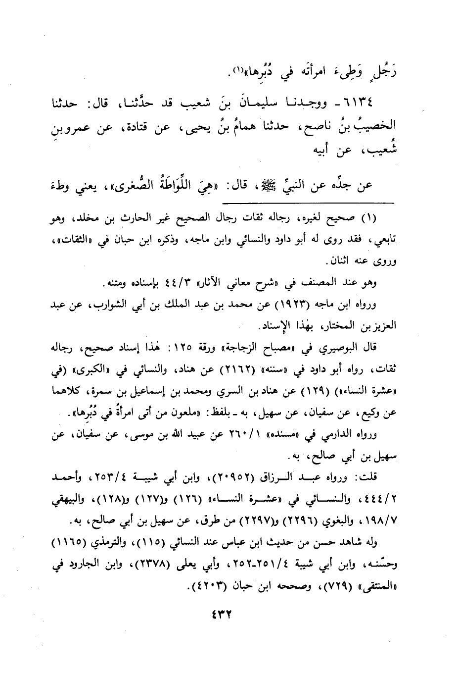 6134 - وَوَجَدْنَا سُلَيْمَانَ بْنَ شُعَيْبٍ قَدْ حَدَّثَنَا قَالَ: حَدَّثَنَا الْخَصِيبُ بْنُ نَاصِحٍ، حَدَّثَنَا هَمَّامُ بْنُ يَحْيَى، عَنْ قَتَادَةَ، عَنْ عَمْرِو بْنِ شُعَيْبٍ، عَنْ أَبِيهِ، عَنْ جَدِّهِ، عَنِ النَّبِيِّ صَلَّى اللَّهُ عَلَيْهِ وَسَلَّمَ، قَالَ: " هِيَ اللِّوَاطَةُ الصُّغْرَى " يَعْنِي وَطْءَ -[433]- النِّسَاءِ فِي أَدْبَارِهِنَّ