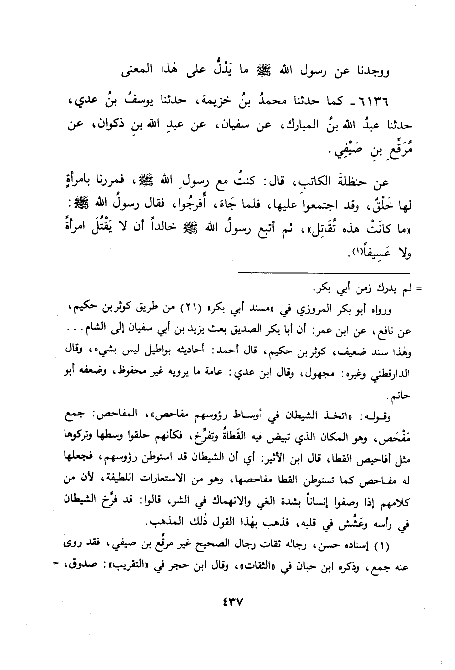 6136 - كَمَا حَدَّثَنَا مُحَمَّدُ بْنُ خُزَيْمَةَ، حَدَّثَنَا يُوسُفُ بْنُ عَدِيٍّ، حَدَّثَنَا عَبْدُ اللهِ بْنُ الْمُبَارَكِ، عَنْ سُفْيَانَ، عَنْ عَبْدِ اللهِ بْنِ ذَكْوَانَ، عَنْ مُرَقَّعِ بْنِ صَيْفِيٍّ، عَنْ حَنْظَلَةَ الْكَاتِبِ قَالَ: كُنْتُ مَعَ رَسُولِ اللهِ صَلَّى اللَّهُ عَلَيْهِ وَسَلَّمَ، فَمَرَرْنَا بِامْرَأَةٍ لَهَا خَلْقٌ، وَقَدِ اجْتَمَعُوا عَلَيْهَا، فَلَمَّا جَاءَ أَفْرَجُوا، فَقَالَ رَسُولُ اللهِ صَلَّى اللَّهُ عَلَيْهِ وَسَلَّمَ: " مَا كَانَتْ هَذِهِ تُقَاتِلُ ". ثُمَّ أَتْبَعَ رَسُولُ اللهِ صَلَّى اللَّهُ عَلَيْهِ وَسَلَّمَ خَالِدًا أَنْ لَا يَقْتُلَ امْرَأَةً، وَلَا عَسِيفًا " -[438]- قَالَ أَبُو جَعْفَرٍ: فَكَانَ هَذَا الْحَدِيثُ مَرْدُودًا إِلَى حَنْظَلَةَ الْكَاتِبِ، وَلَا نَعْلَمُ أَحَدًا تَابَعَ الثَّوْرِيَّ عَلَى رِوَايَتِهِ كَذَلِكَ، فَمِمَّنْ خَالَفَهُ فِي ذَلِكَ الْمُغِيرَةُ بْنُ عَبْدِ الرَّحْمَنِ الْحِزَامِيُّ