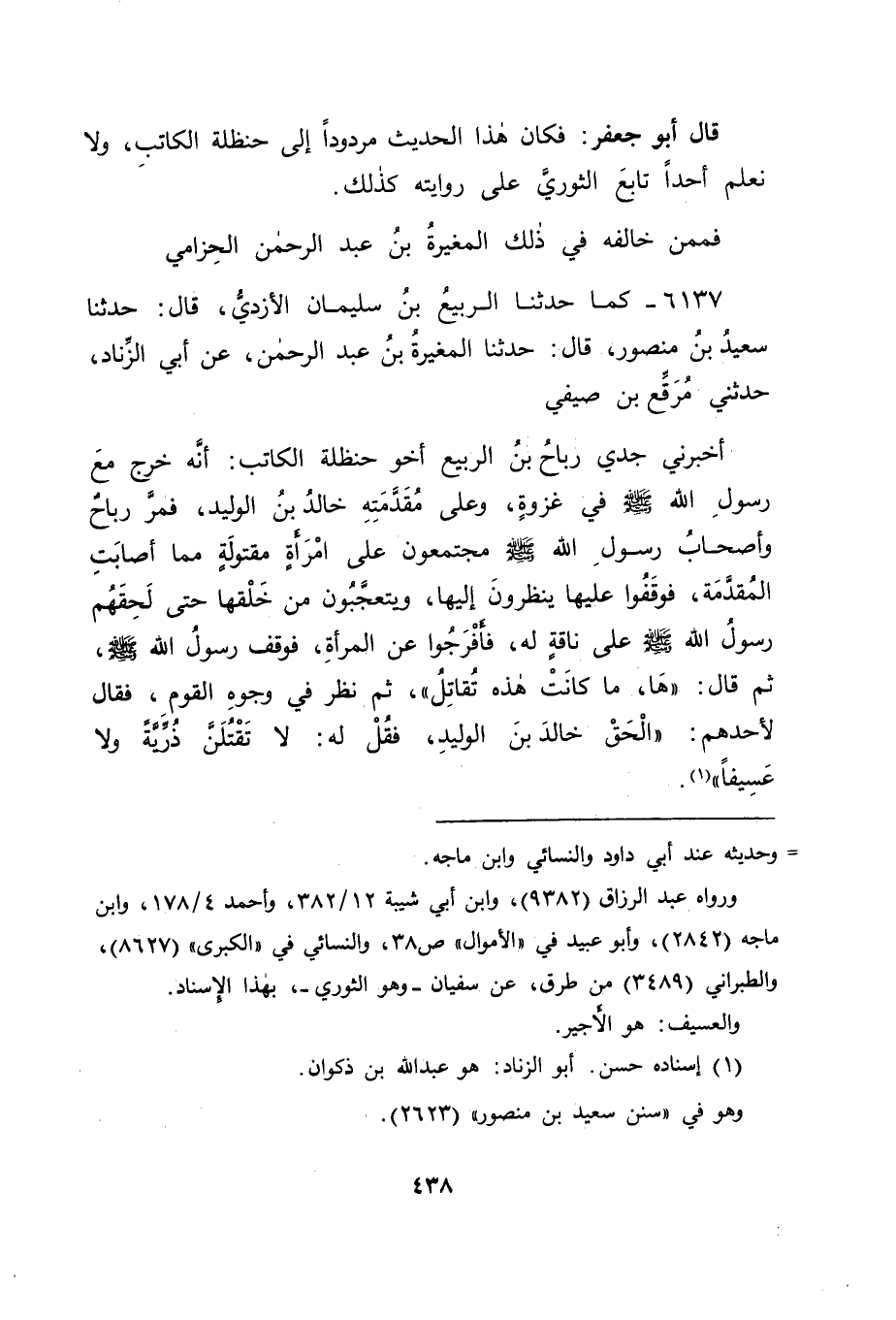 6137 - كَمَا حَدَّثَنَا الرَّبِيعُ بْنُ سُلَيْمَانَ الْأَزْدِيُّ قَالَ: حَدَّثَنَا سَعِيدُ بْنُ مَنْصُورٍ قَالَ: حَدَّثَنَا الْمُغِيرَةُ بْنُ عَبْدِ الرَّحْمَنِ، عَنْ أَبِي الزِّنَادِ، حَدَّثَنِي مُرَقِّعُ بْنُ صَيْفِيٍّ، أَخْبَرَنِي جَدِّي رَبَاحُ بْنُ الرَّبِيعِ أَخُو حَنْظَلَةَ الْكَاتِبِ: أَنَّهُ خَرَجَ مَعَ رَسُولِ اللهِ صَلَّى اللَّهُ عَلَيْهِ وَسَلَّمَ فِي غَزْوَةٍ، وَعَلَى مُقَدِّمَتِهِ خَالِدُ بْنُ الْوَلِيدِ، فَمَرَّ رَبَاحٌ وَأَصْحَابُ رَسُولِ اللهِ صَلَّى اللَّهُ عَلَيْهِ وَسَلَّمَ مُجْتَمِعُونَ عَلَى امْرَأَةٍ مَقْتُولَةٍ، مِمَّا أَصَابَتِ الْمُقَدِّمَةَ، فَوَقَفُوا عَلَيْهَا يَنْظُرُونَ إِلَيْهَا، وَيَتَعَجَّبُونَ مِنْ خَلْقِهَا، حَتَّى لَحِقَهُمْ رَسُولُ اللهِ صَلَّى اللَّهُ عَلَيْهِ وَسَلَّمَ عَلَى نَاقَةٍ لَهُ، فَأَفْرَجُوا عَنِ الْمَرْأَةِ، فَوَقَفَ رَسُولُ اللهِ صَلَّى اللَّهُ عَلَيْهِ وَسَلَّمَ، ثُمَّ قَالَ: " هَا، مَا كَانَتْ هَذِهِ تُقَاتِلُ "، ثُمَّ نَظَرَ فِي وُجُوهِ الْقَوْمِ، فَقَالَ لِأَحَدِهِمْ: " الْحَقْ خَالِدَ بْنَ الْوَلِيدِ، فَقُلْ لَهُ: لَا تَقْتُلَنَّ ذُرِّيَّةً، وَلَا عَسِيفًا " -[439]- وَمِنْهُمْ عَبْدُ الرَّحْمَنِ بْنُ أَبِي الزِّنَادِ، عَنْ أَبِيهِ