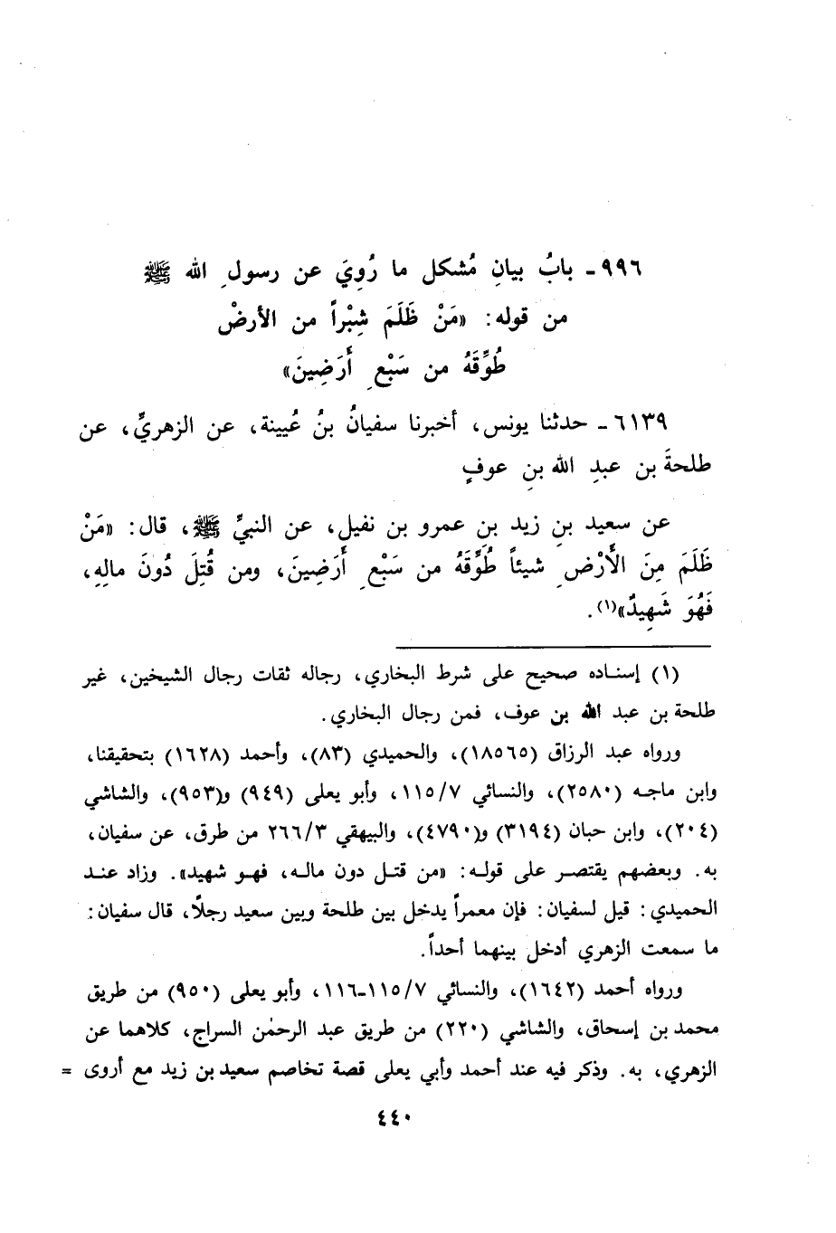 6139 - حَدَّثَنَا يُونُسُ، أَخْبَرَنَا سُفْيَانُ بْنُ عُيَيْنَةَ، عَنِ الزُّهْرِيِّ، عَنْ طَلْحَةَ بْنِ عَبْدِ اللهِ بْنِ عَوْفٍ، عَنْ سَعِيدِ بْنِ زَيْدِ بْنِ عَمْرِو بْنِ نُفَيْلٍ، عَنِ النَّبِيِّ صَلَّى اللَّهُ عَلَيْهِ وَسَلَّمَ قَالَ: " مَنْ ظَلَمَ مِنَ الْأَرْضِ شَيْئًا طُوِّقَهُ مِنْ سَبْعِ أَرَضِينَ، وَمَنْ قُتِلَ دُونَ مَالِهِ فَهُوَ شَهِيدٌ " -[441]- وَقَدْ خُولِفَ سُفْيَانُ فِي إِسْنَادِ هَذَا الْحَدِيثِ، فَأَدْخَلَ فِيهِ بَيْنَ طَلْحَةَ بْنِ عَبْدِ اللهِ وَبَيْنَ سَعِيدِ بْنِ زَيْدٍ عَبْدَ الرَّحْمَنِ بْنَ عَمْرِو بْنِ سَهْلٍ فَمِمَّنْ رَوَاهُ عَنِ الزُّهْرِيِّ كَذَلِكَ مَالِكُ بْنُ أَنَسٍ