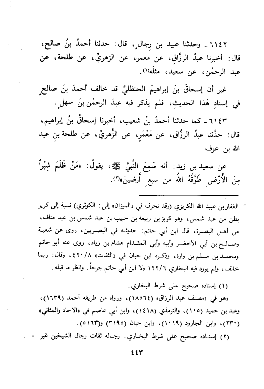 6143 - كَمَا حَدَّثَنَا أَحْمَدُ بْنُ شُعَيْبٍ، أَخْبَرَنَا إِسْحَاقُ بْنُ إِبْرَاهِيمَ قَالَ: حَدَّثَنَا عَبْدُ الرَّزَّاقِ، عَنْ مَعْمَرٍ، عَنِ الزُّهْرِيِّ، عَنْ طَلْحَةَ بْنِ عَبْدِ اللهِ بْنِ عَوْفٍ، عَنْ سَعِيدِ بْنِ زَيْدٍ: أَنَّهُ سَمِعَ النَّبِيَّ صَلَّى اللَّهُ عَلَيْهِ وَسَلَّمَ يَقُولُ: " مَنْ ظَلَمَ شِبْرًا مِنَ الْأَرْضِ طَوَّقَهُ اللهُ مِنْ سَبْعِ أَرَضِينَ " -[444]- وَقَدْ وَافَقَ سُفْيَانُ فِي تَرْكِهِ إِدْخَالَ عَبْدِ الرَّحْمَنِ بْنِ عَمْرٍو رَاوِي إِسْنَادِ هَذَا الْحَدِيثِ سُلَيْمَانَ بْنِ كَثِيرٍ