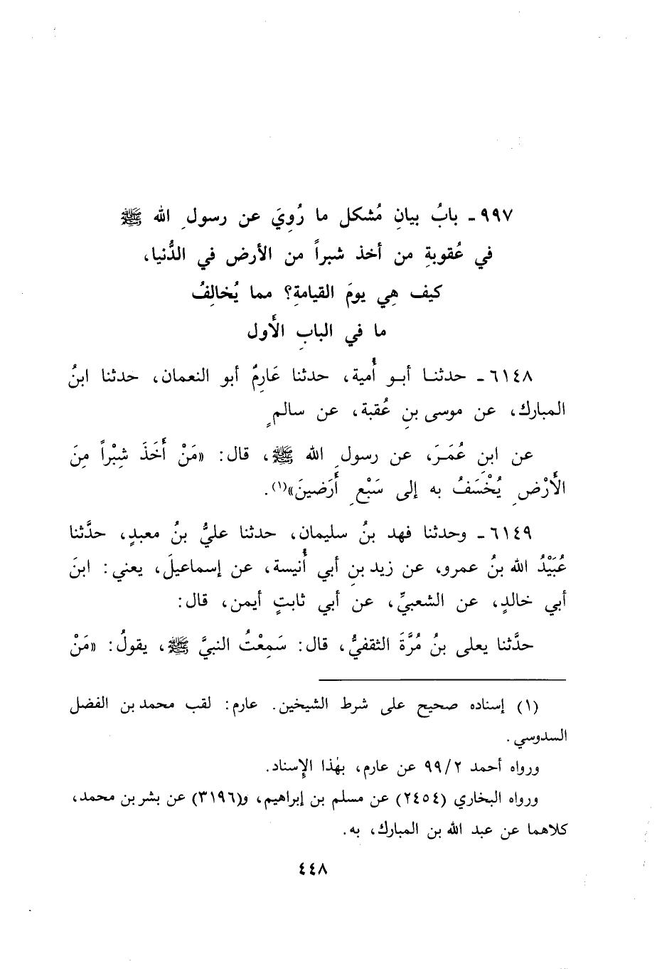 6148 - حَدَّثَنَا أَبُو أُمَيَّةَ، حَدَّثَنَا عَارِمٌ أَبُو النُّعْمَانِ، حَدَّثَنَا ابْنُ الْمُبَارَكِ، عَنْ مُوسَى بْنِ عُقْبَةَ، عَنْ سَالِمٍ، عَنِ ابْنِ عُمَرَ، عَنْ رَسُولِ اللهِ صَلَّى اللَّهُ عَلَيْهِ وَسَلَّمَ، قَالَ: " مَنْ أَخَذَ شِبْرًا مِنَ الْأَرْضِ يُخْسَفُ بِهِ إِلَى سَبْعِ أَرَضِينَ "