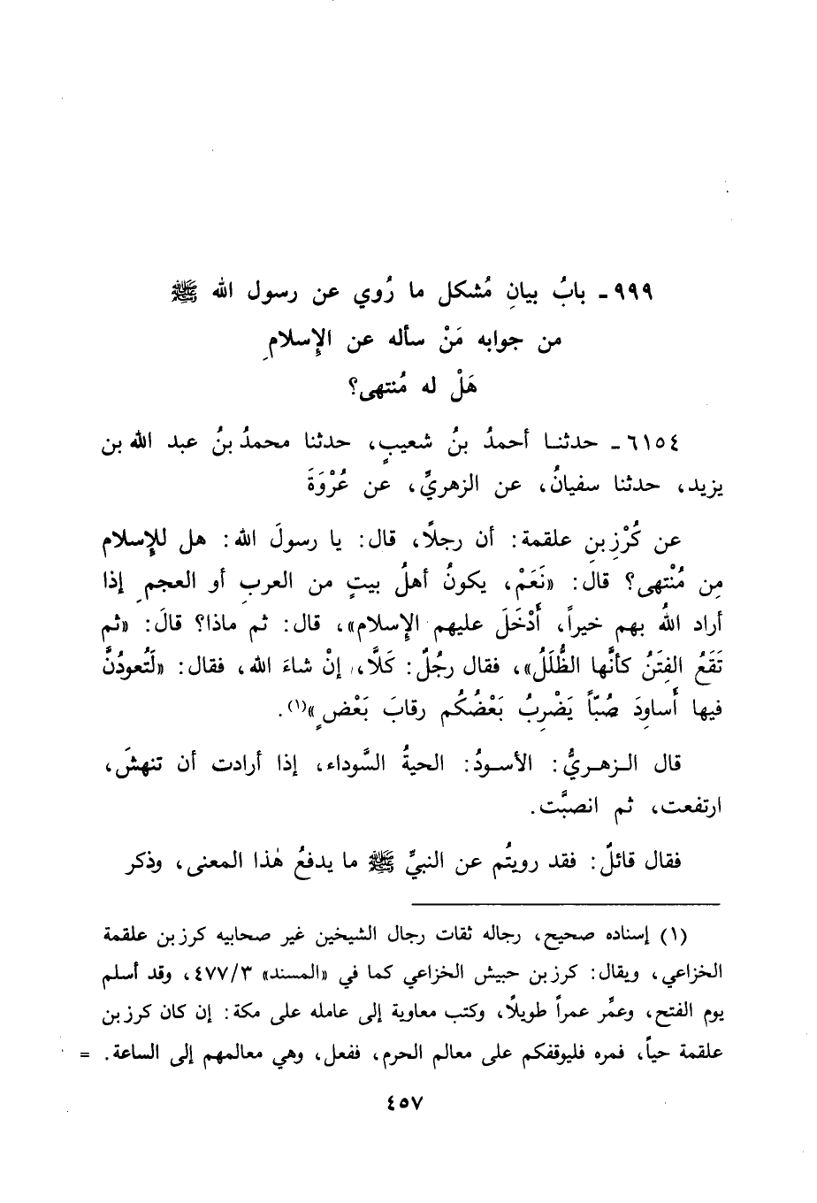 6154 - حَدَّثَنَا أَحْمَدُ بْنُ شُعَيْبٍ، حَدَّثَنَا مُحَمَّدُ بْنُ عَبْدِ اللهِ بْنِ يَزِيدَ، حَدَّثَنَا سُفْيَانُ، عَنِ الزُّهْرِيِّ، عَنْ عُرْوَةَ، عَنْ كُرْزِ بْنِ عَلْقَمَةَ: أَنَّ رَجُلًا قَالَ: يَا رَسُولَ اللهِ، هَلْ لِلْإِسْلَامِ مِنْ مُنْتَهًى؟ قَالَ: " نَعَمْ، يَكُونُ أَهْلُ بَيْتٍ مِنَ الْعَرَبِ، أَوِ الْعَجَمِ إِذَا أَرَادَ اللهُ بِهِمْ خَيْرًا أَدْخَلَ عَلَيْهِمُ الْإِسْلَامَ "، قَالَ: ثُمَّ مَاذَا؟ قَالَ: " ثُمَّ تَقَعُ الْفِتَنُ، كَأَنَّهَا الظُّلَلُ "، فَقَالَ رَجُلٌ: كَلَّا، إِنْ شَاءَ اللهُ، فَقَالَ: " لَتَعُودُنَّ فِيهَا أَسَاوِدَ صُبًّا يَضْرِبُ بَعْضُكُمْ رِقَابَ بَعْضٍ " قَالَ الزُّهْرِيُّ: الْأَسْوَدُ: الْحَيَّةُ السَّوْدَاءُ، إِذَا أَرَادَتْ أَنْ تَنْهَشَ ارْتَفَعَتْ، ثُمَّ انْصَبَّتْ فَقَالَ قَائِلٌ: فَقَدْ رُوِّيتُمْ عَنِ النَّبِيِّ صَلَّى اللَّهُ عَلَيْهِ وَسَلَّمَ مَا يَدْفَعُ هَذَا الْمَعْنَى، وَذَكَرَ
